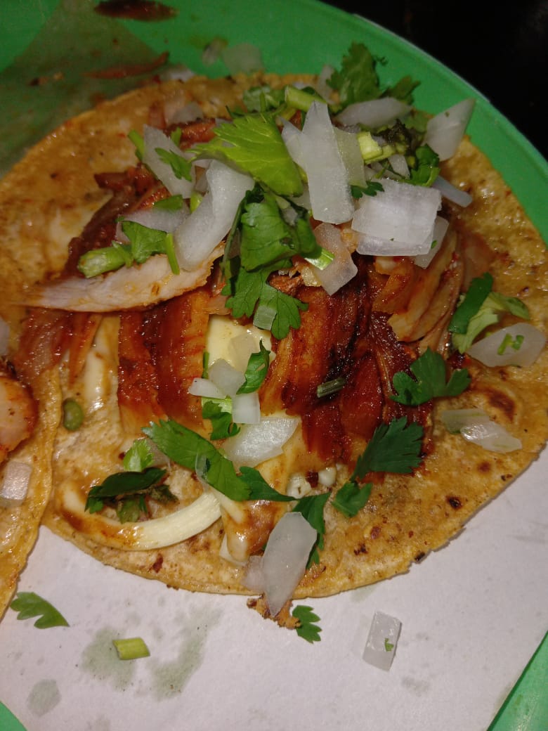 Tortilla de maíz con queso de hebra, carne al pastor, cebolla, cilantro.