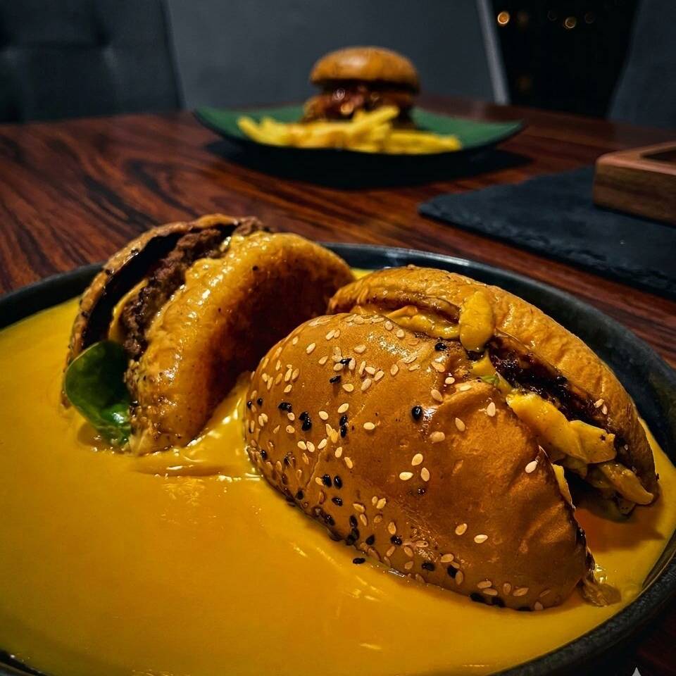 Smash Clásica bañada en mucho queso cheddar acompañado de papas