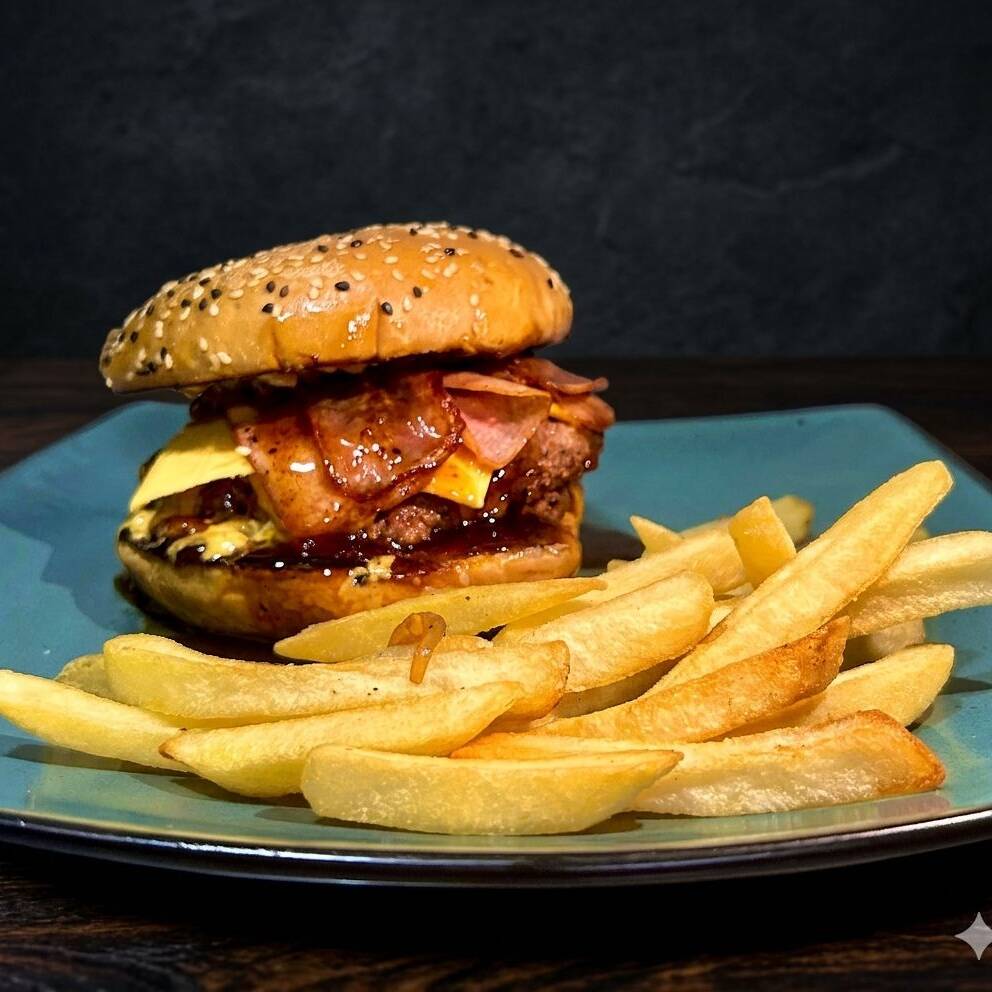Smash Clásica más rebanadas de tocino dorado y salsa BBQ. Acompañado de papas.