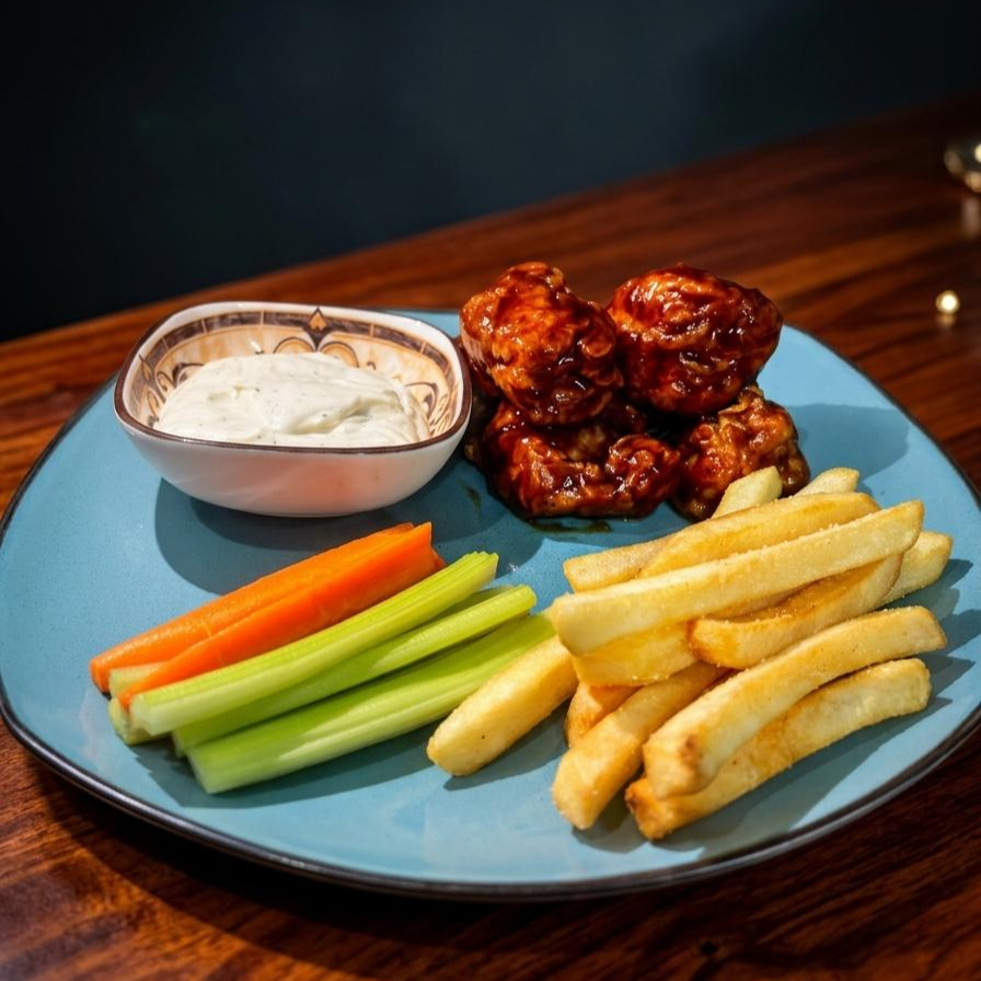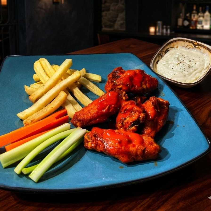 Alitas Max bañadas en salsa de tu eleccion y acompañadas de Aderezo Ranch, Apio y Zanahoria