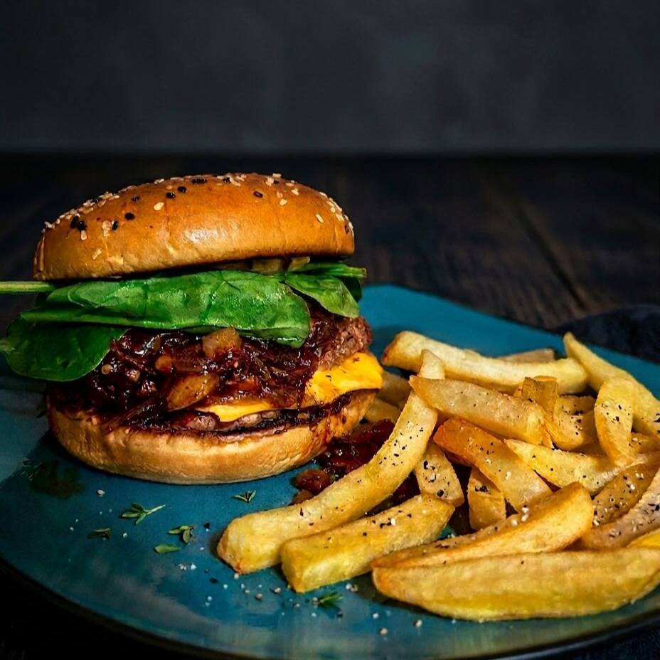 Smash Clásica más nuestra deliciosa mermelada de tocino y cebolla con toque picosito. Acompañado de papas.
