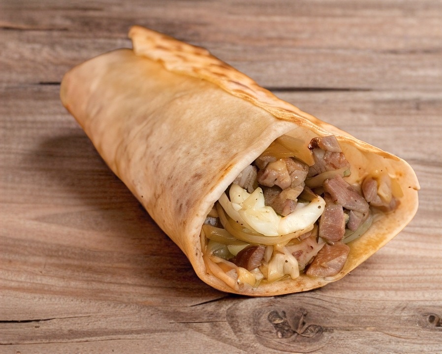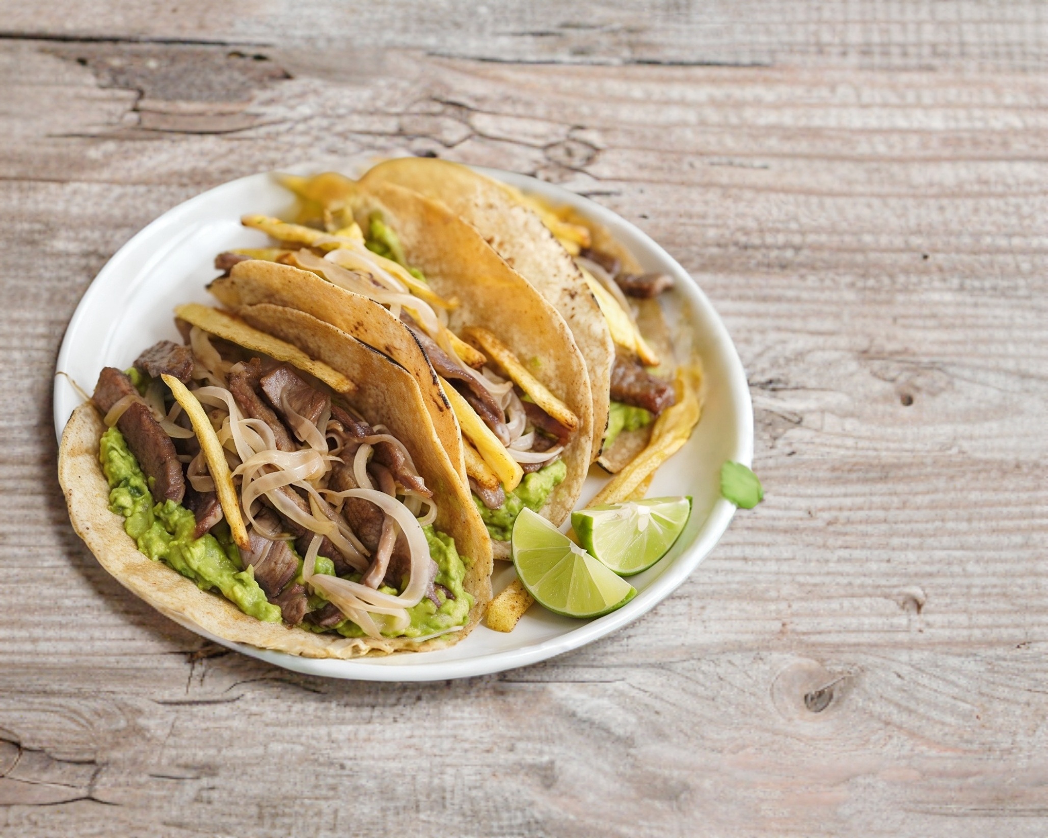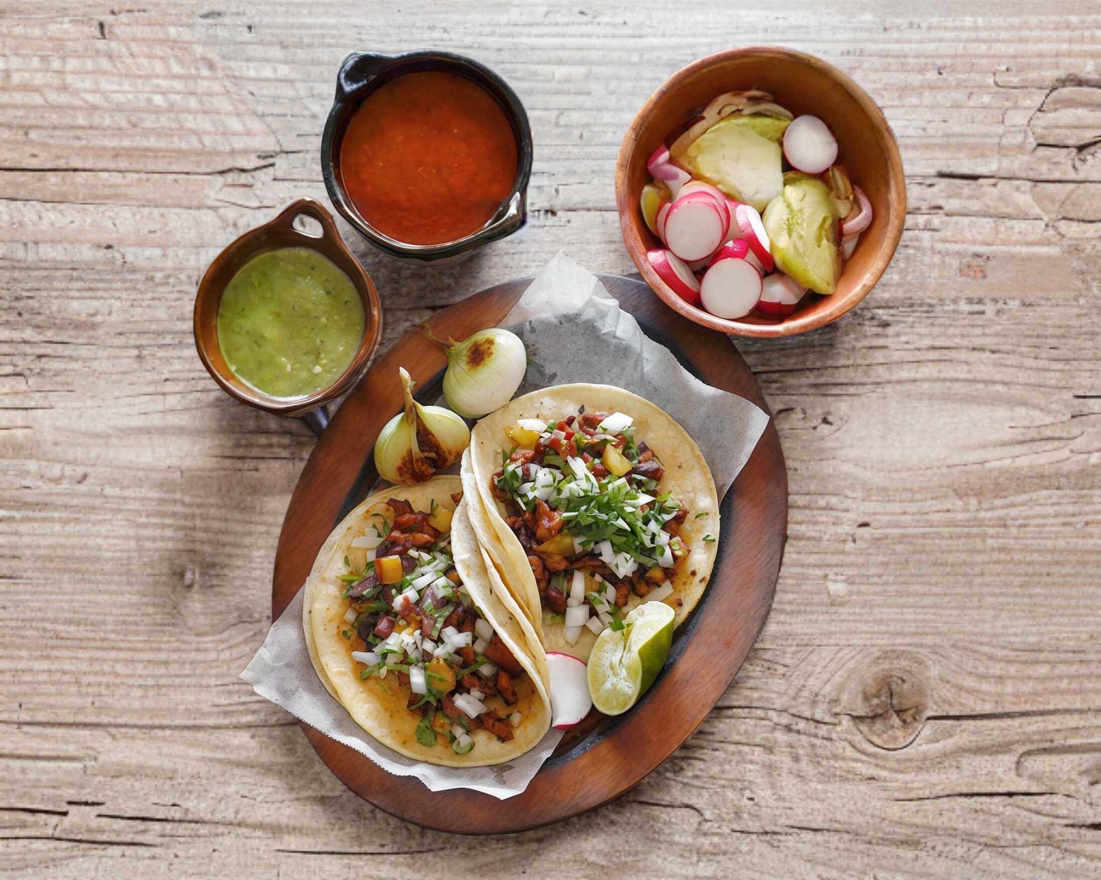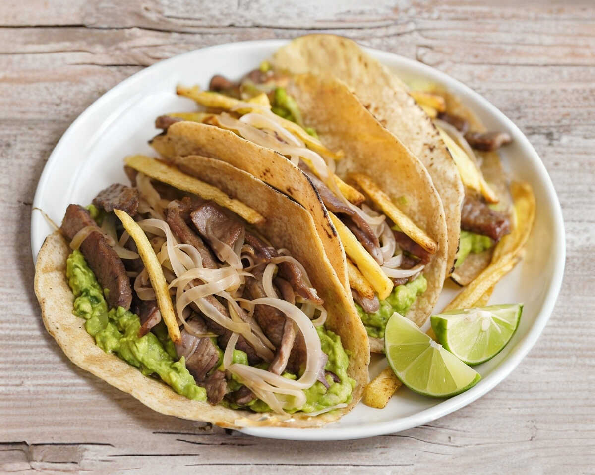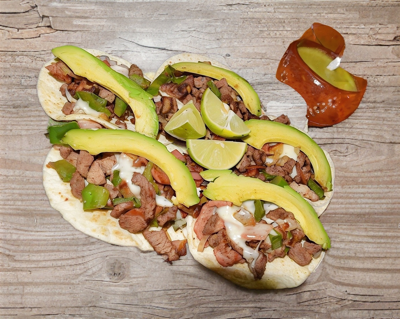Bistec, tocino, jamón, cebolla, morrón y queso. Tortillas, salsas y verdura
