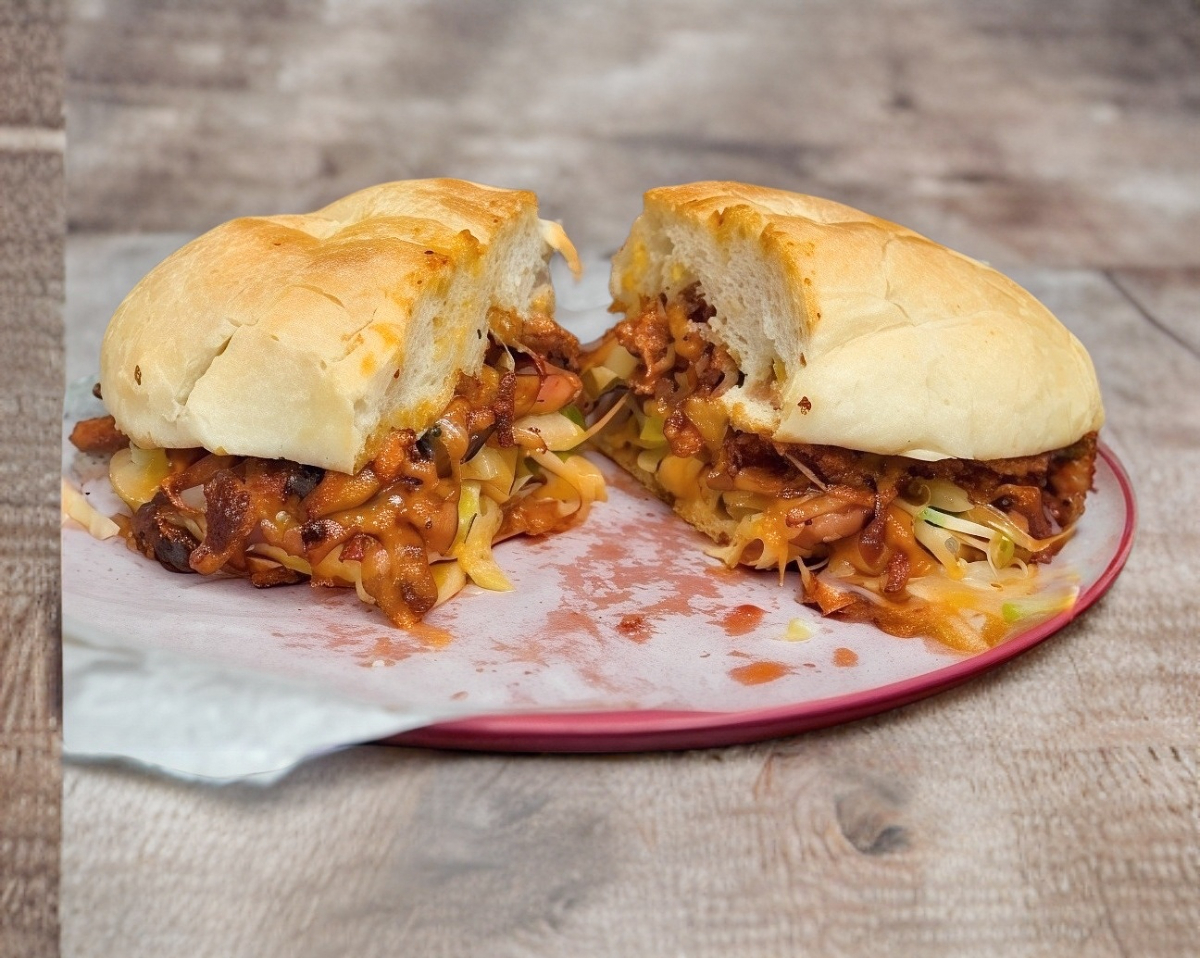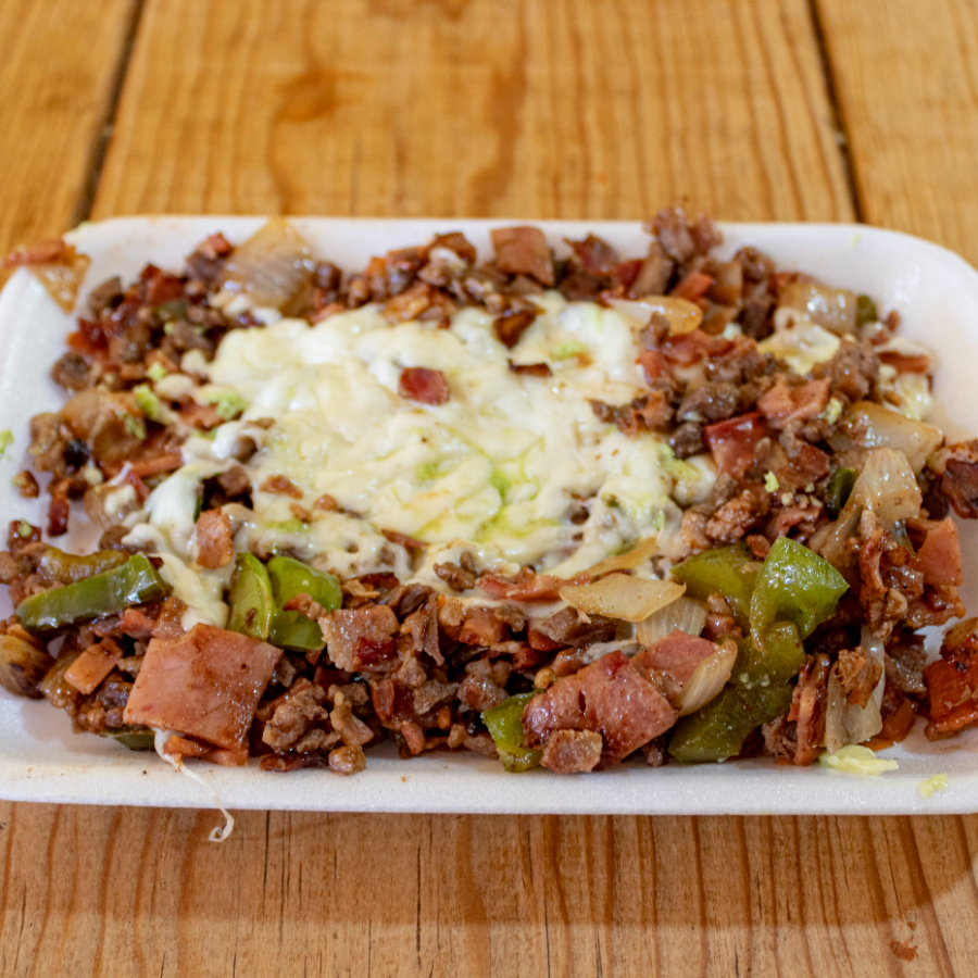 Bistec, jamon, tocino, cebolla, y morron con queso