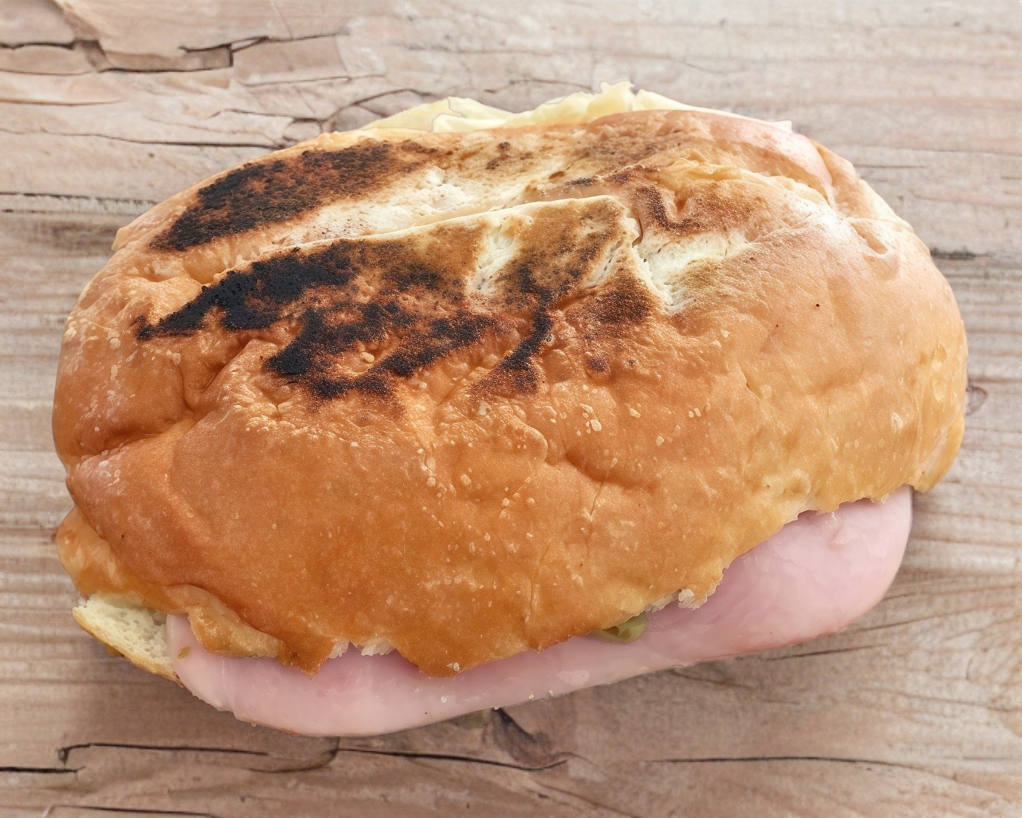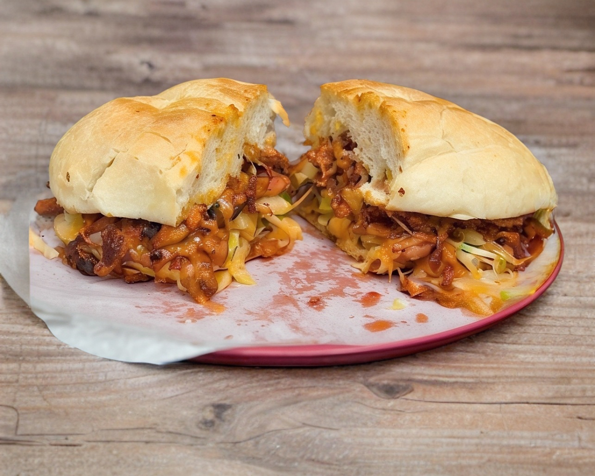 Torta con pan telera, pastor y bistec, queso, aguacate y mayonesa