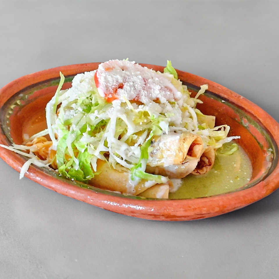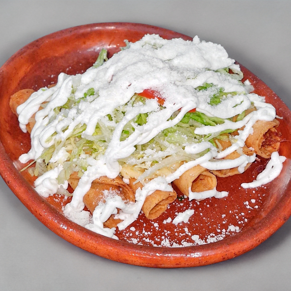 5 flautitas de carne de res con papa, lechuga, tomate, queso Chihuahua, queso en polvo y crema
