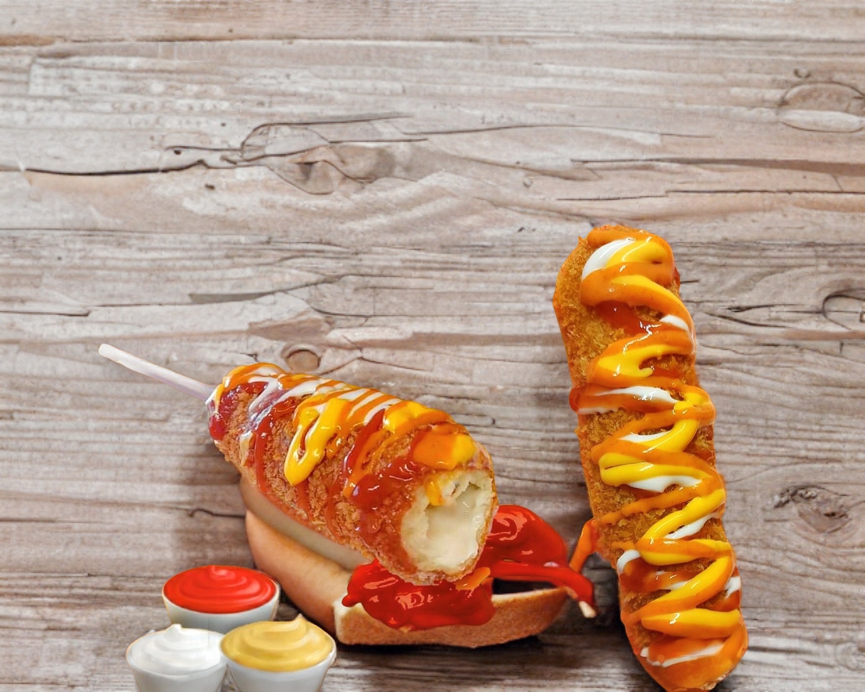 Banderilla rellena de queso, envuelta en masa coreana, cubierta con Panko.