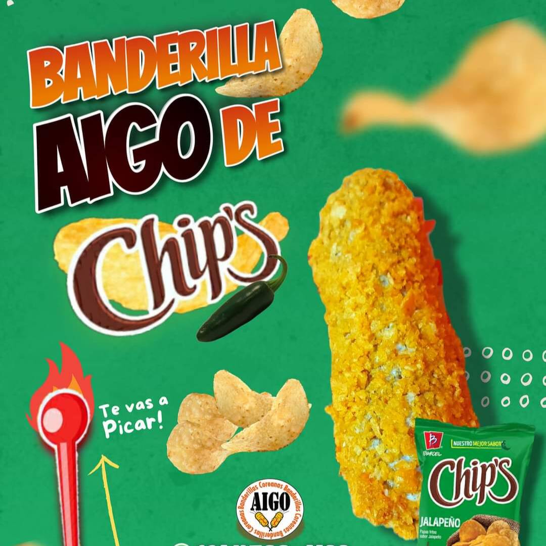 Banderilla rellena de salchi-queso, envuelta en masa coreana, empanizada con panko, cubierta de chip´s fuego.