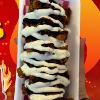 Banderilla rellena de winnie, envuelta en masa coreana, cubierta con cuadritos de papa a la francesa y panko, espolvoreada con azúcar y canela.