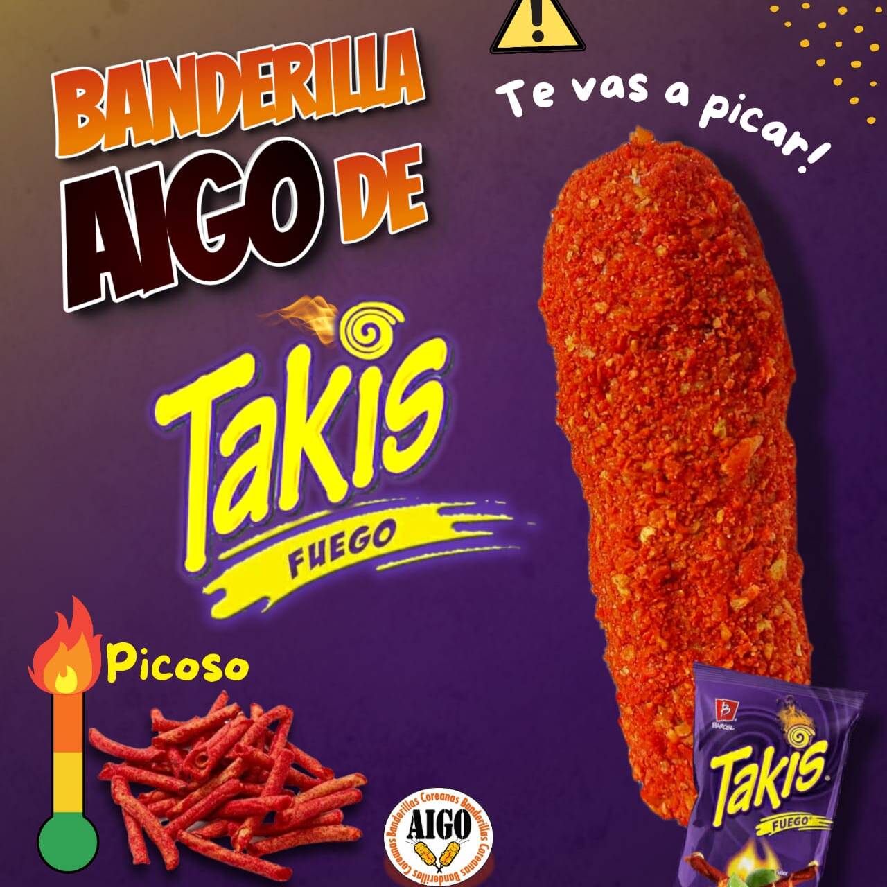 Banderilla rellena de queso laurel, envuelta en masa coreana, empanizada con panko, cubierta de Takis fuego.