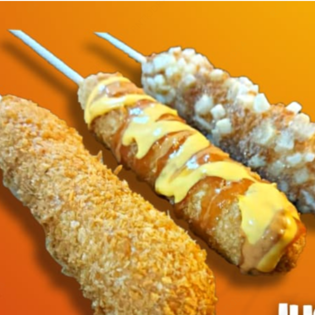 Banderilla rellena de queso, envuelta en masa coreana, cubierta con panko.