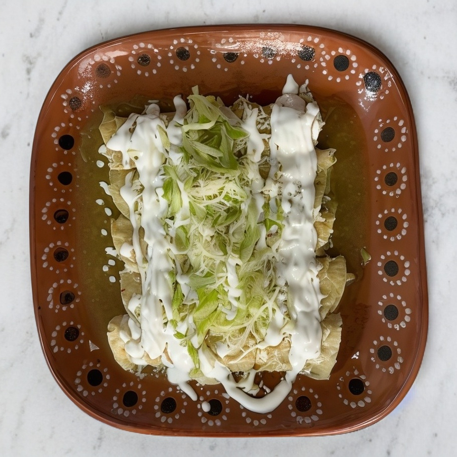 Totopos de tortilla frita bañados en salsa verde casera, acompañados de queso, crema y proteína de tu elección