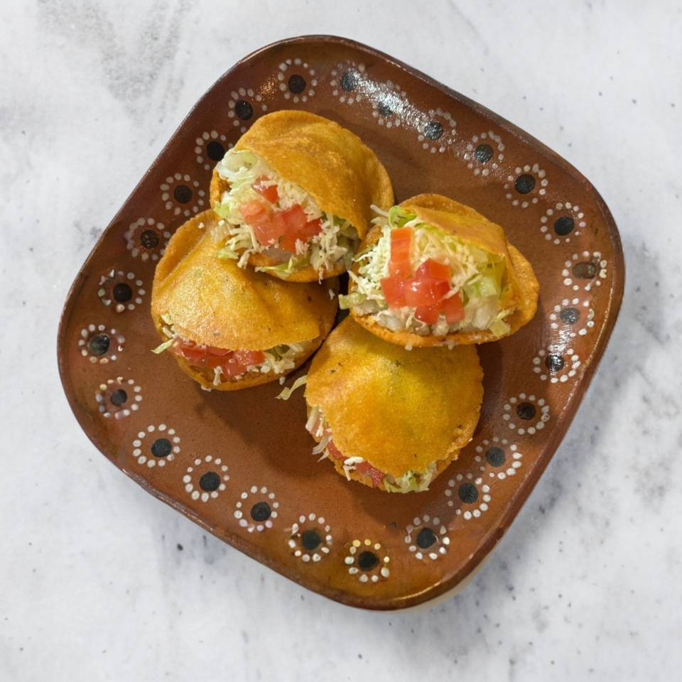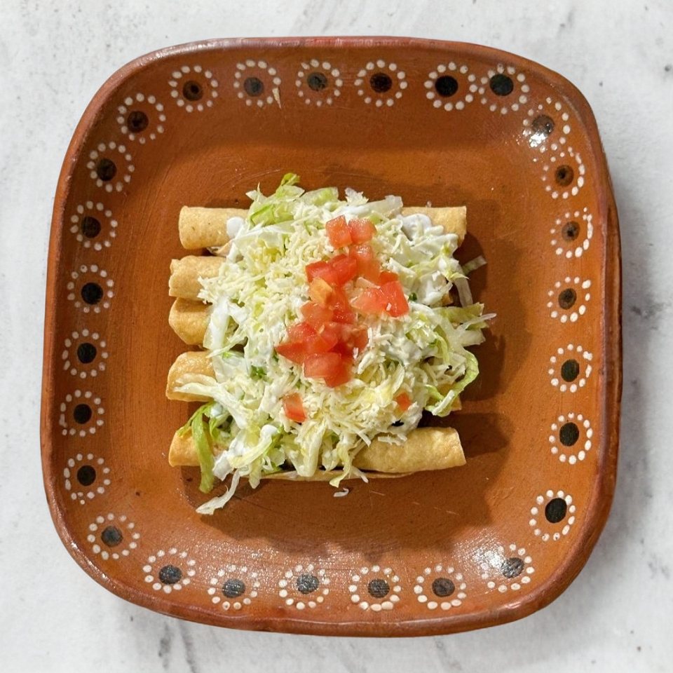 Orden con 5 flautas de pollo acompañadas de lechuga, queso, crema y tomate