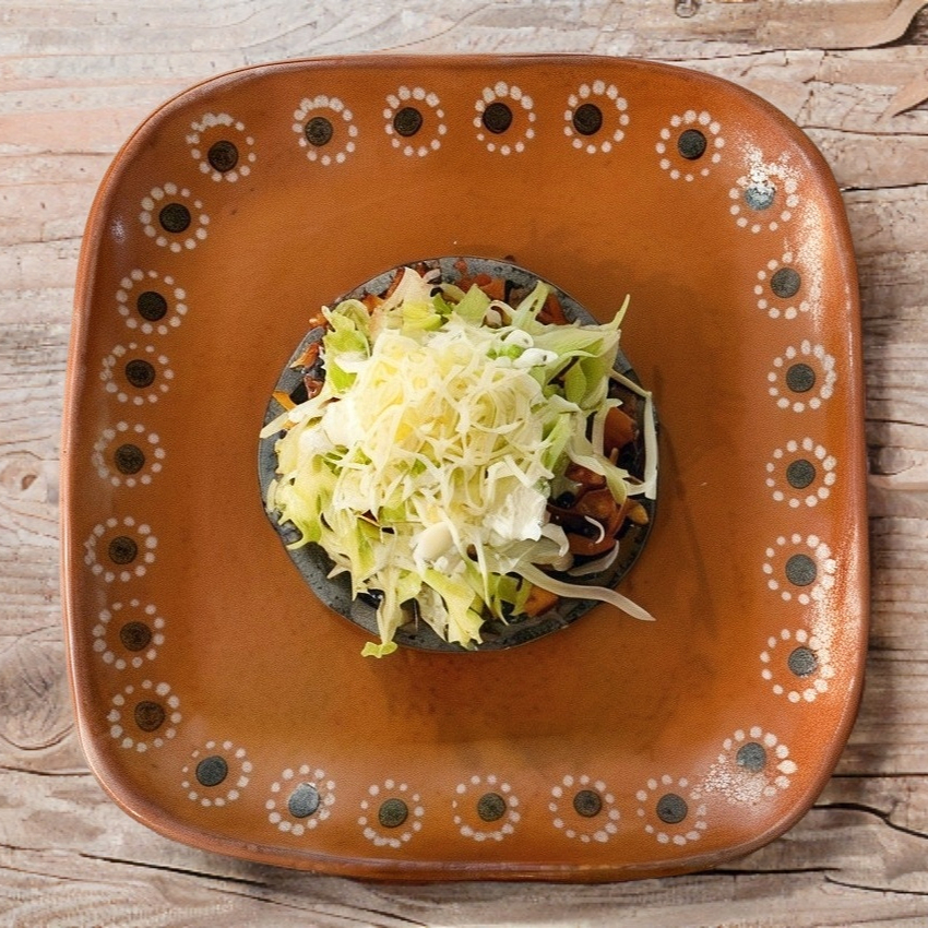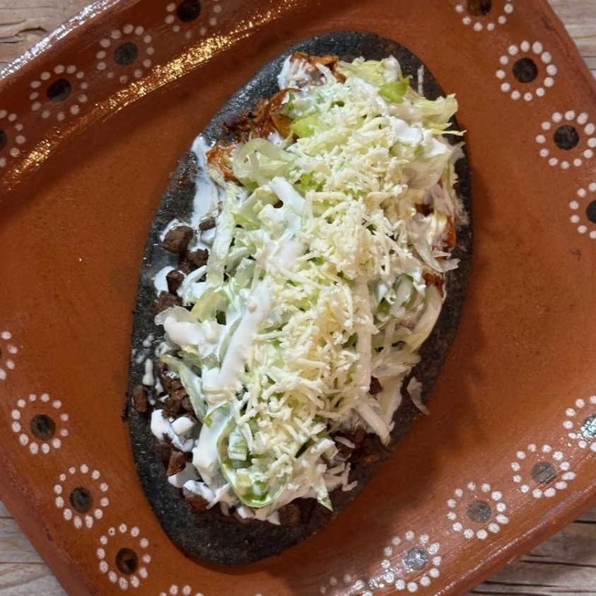 Tortilla de 14 cm elaborada con masa de maíz azul, acompañada con frijoles, queso, guisado, lechuga y crema