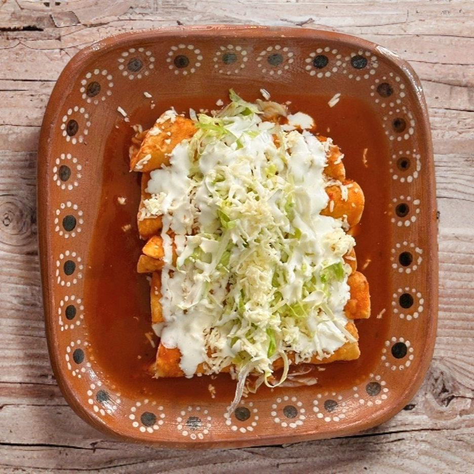 Orden de 5 enchiladas rellenas de pollo, bañadas en salsa roja casera acompañadas de lechuga queso y crema