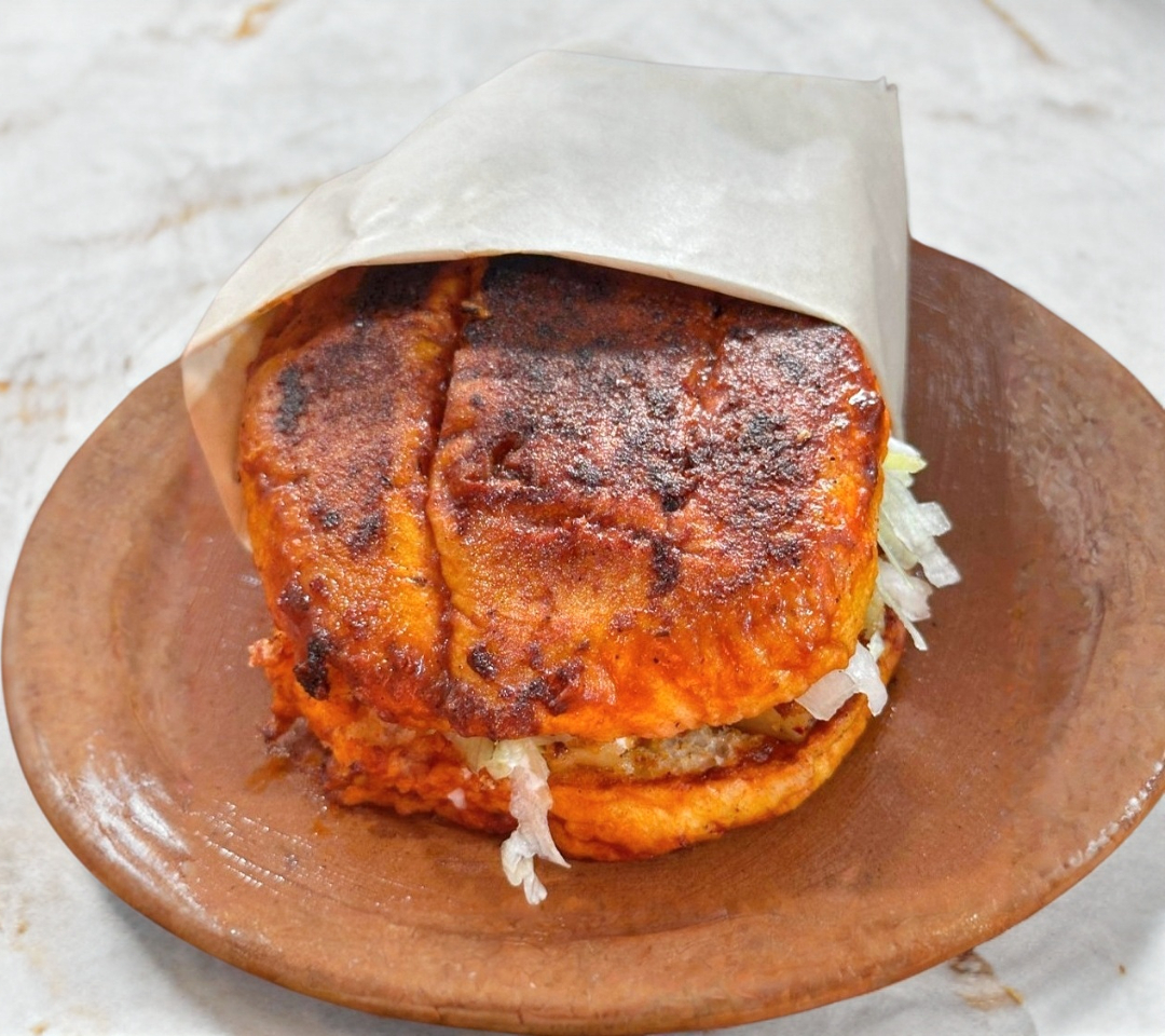 Pan de torta bañado con chile colorado, relleno de papa con chorizo acompañado de lechuga, queso y crema