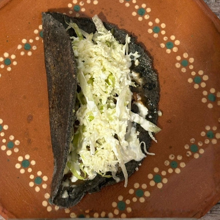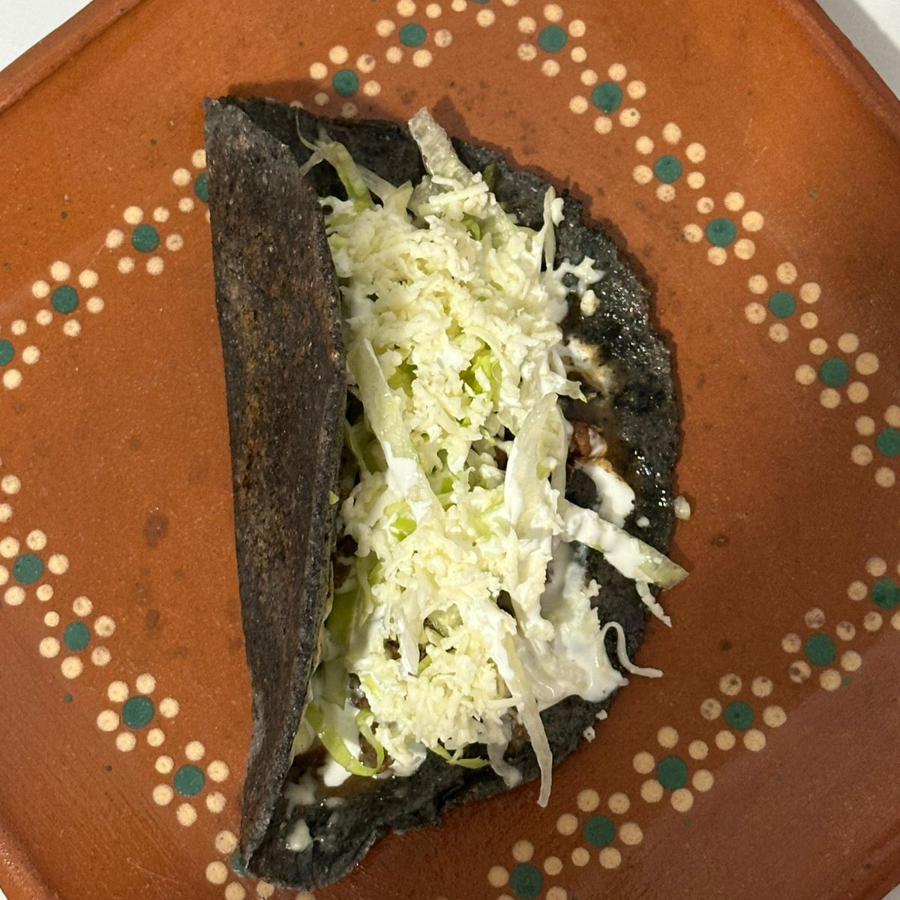 Tortilla de 14 cm elaborada con masa de maíz azul, doblada y acompañada con queso, guisado, lechuga y crema