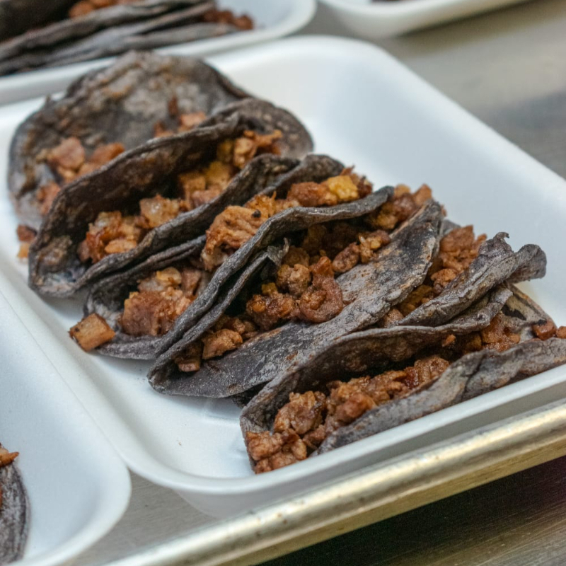 Orden de 5 tacos con tortilla de maiz azul acompañado con verdura y salsa