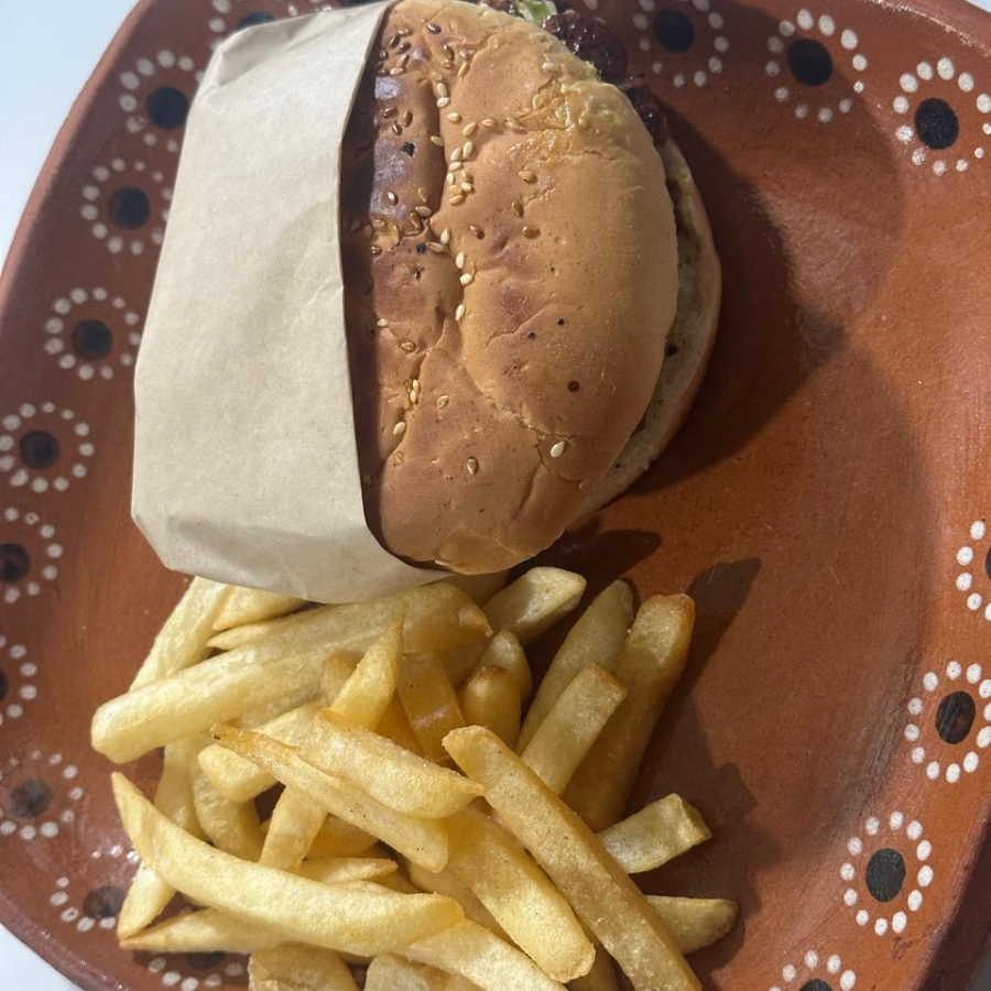 Pan untado con aderezo, jugosa carne sazonada, queso, lechuga, tomate y cebolla