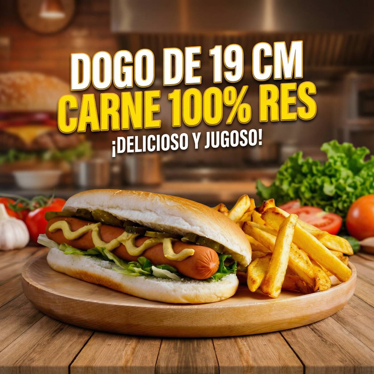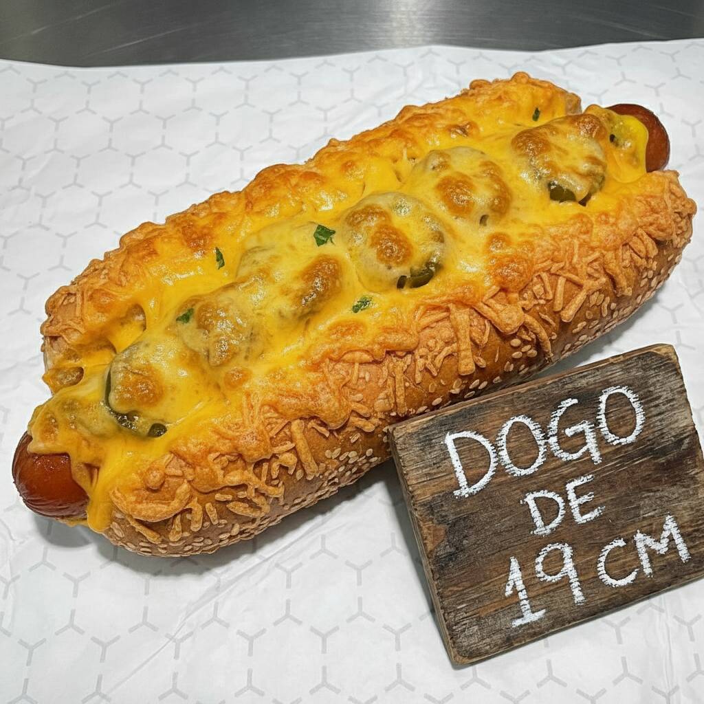 Hotdog de 19 cm, Salchicha 100% res envuelta en tocino, Frijoles, Mayonesa, Kétchup, Mostaza, Pepinillos, Champiñones, Elote, Chile curtido. Todo esto cubierto con una costra de 4 quesos.