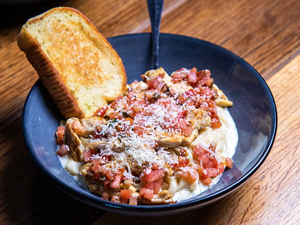 Pasta fetuccini mezclada con brócoli fresco, salsa Alfredo y pechuga de pollo a la parrilla, se sirve con pan de ajo.