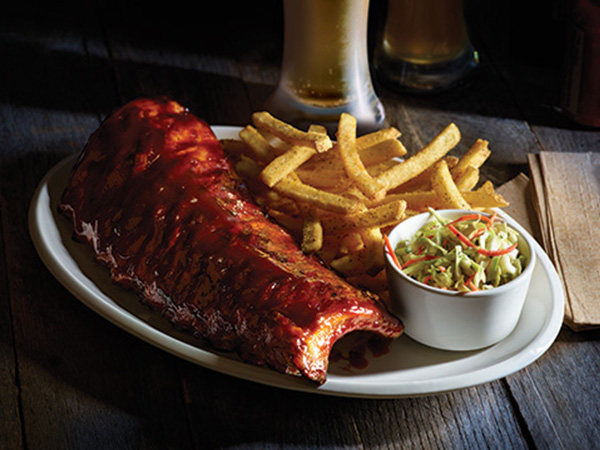 Jugoso costillar de cerdo asado a la parrilla y bañado con la salsa de tu elección. Se acompaña con papas fritas.