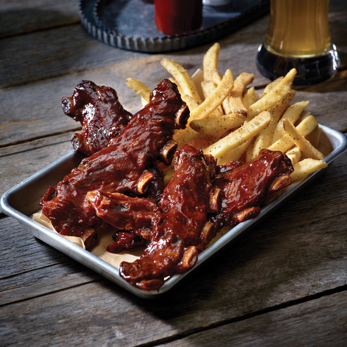 Media porción de costillas de cerdo ahumadas y bañadas en la salsa de tu elección, acompañadas de papas fritas.