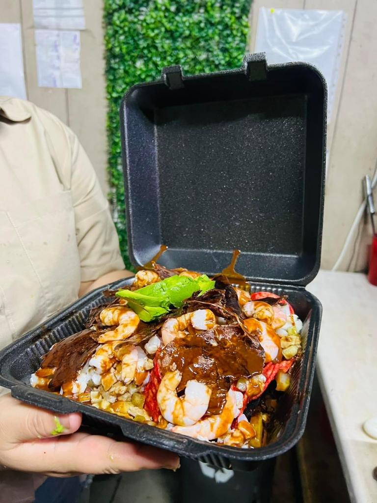 12 Camarones, 2 bolsas de Tostitos, ceviche de pescado, aguacate, machaca, aceitunas.