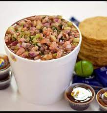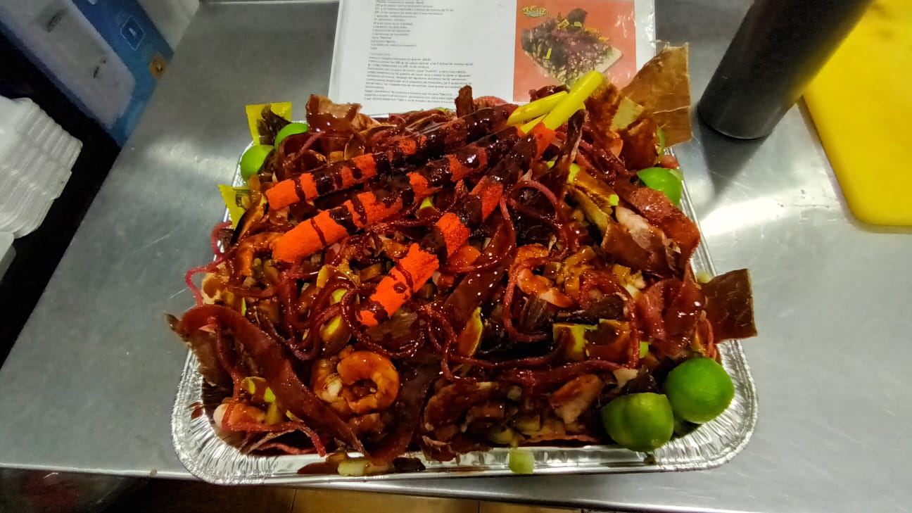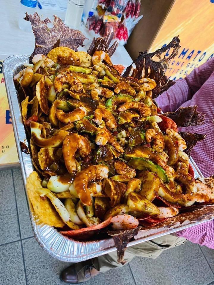 Tostitos, camarón, ceviche de pescado, pepino, carne seca, cacahuate, aguacate, 1 kg.