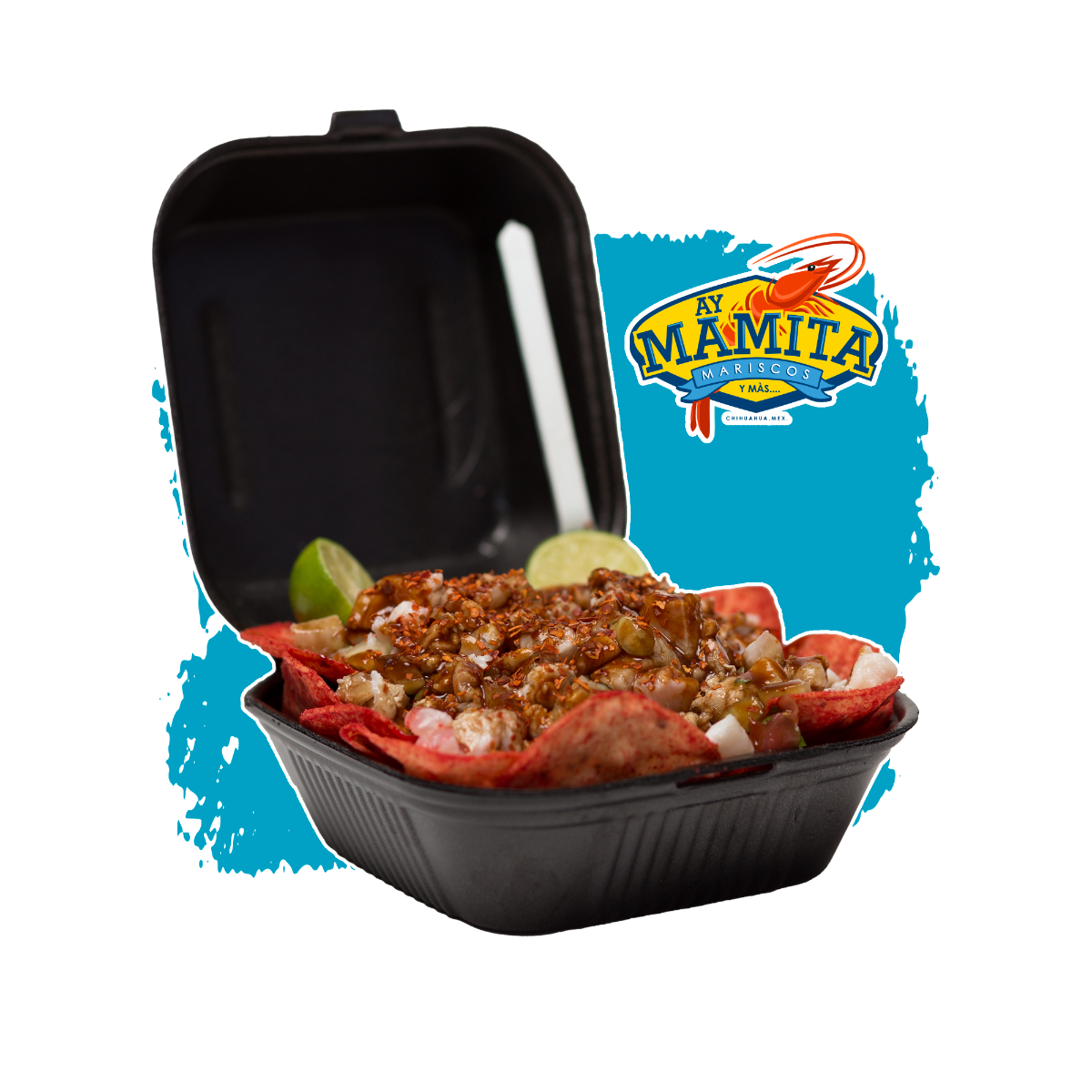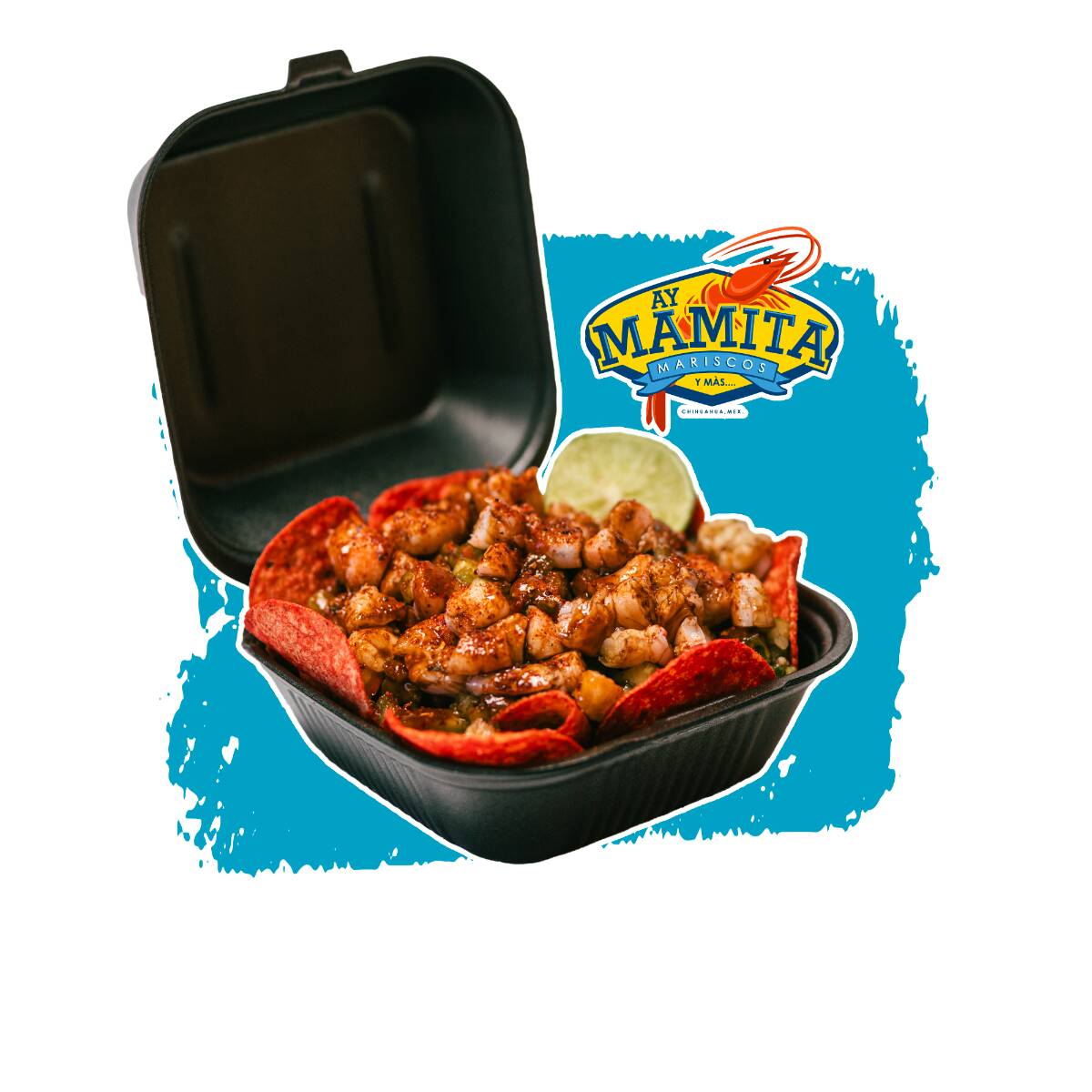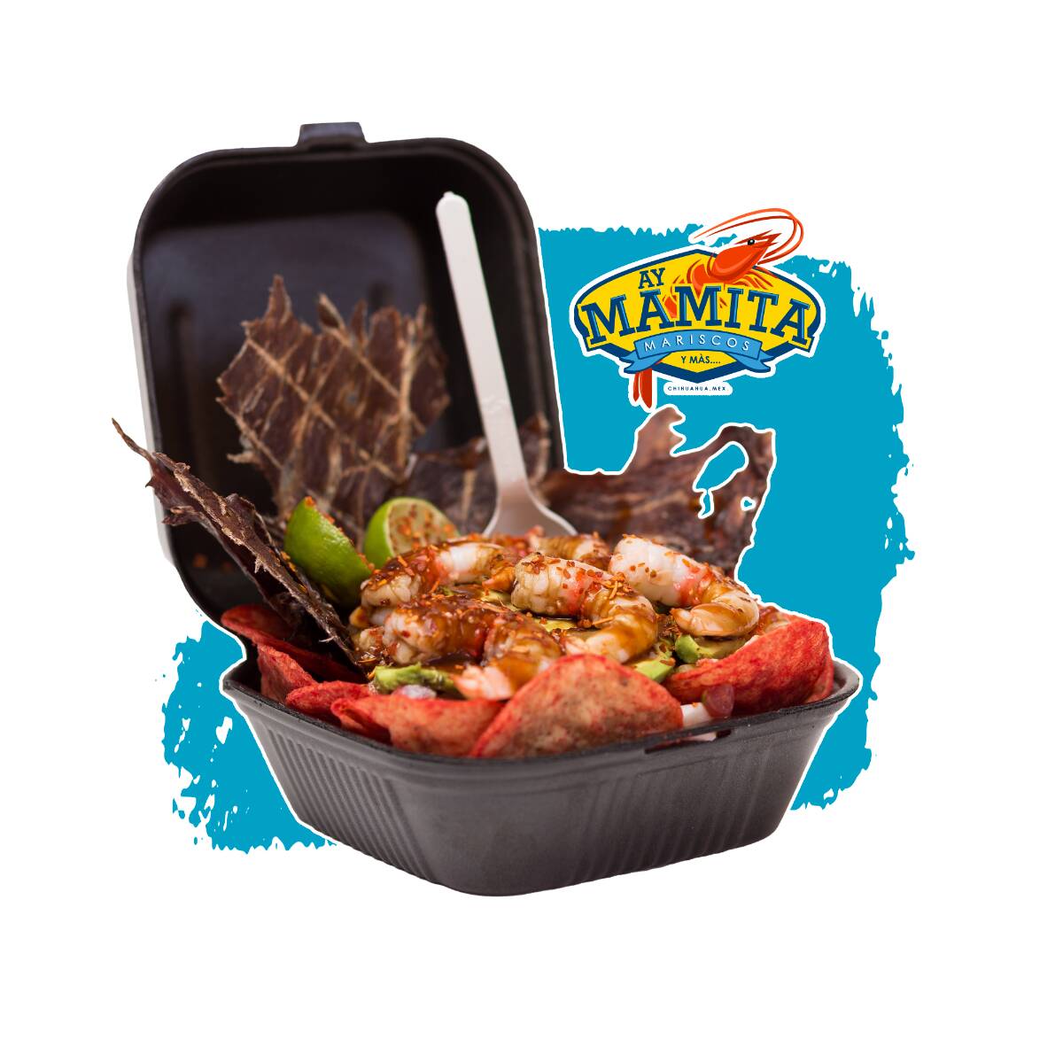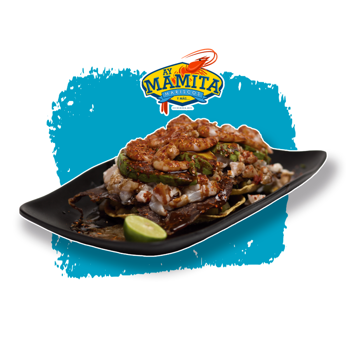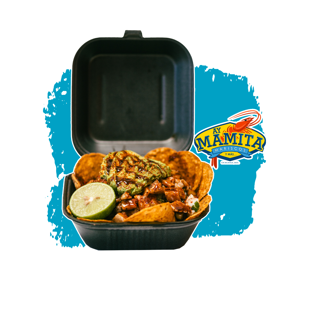 Mega charola, 200 g de papas caseras, 250 g de Tostitos, carne seca, 18 camarones, aguacate, serpentinas, Skwinkles y banderitas.