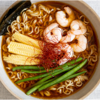 Ramen preparado con una docena de camarón.