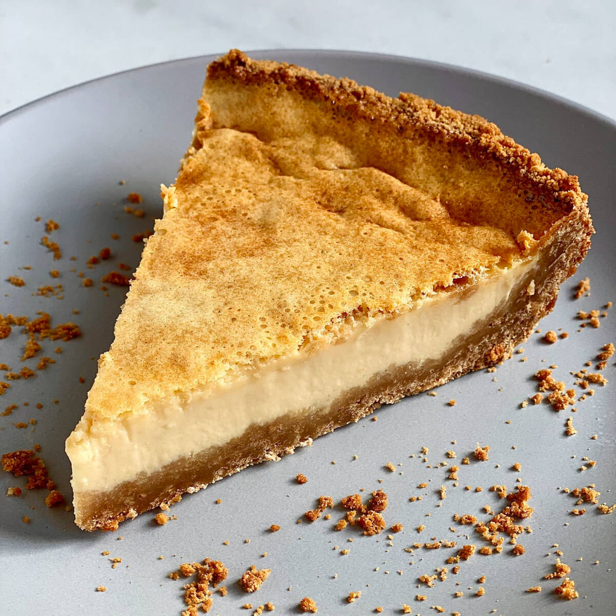 Riquísima y cremosa rebanada de nuestro pay de queso horneado, con ganache y toppings de chocolate y nuez.