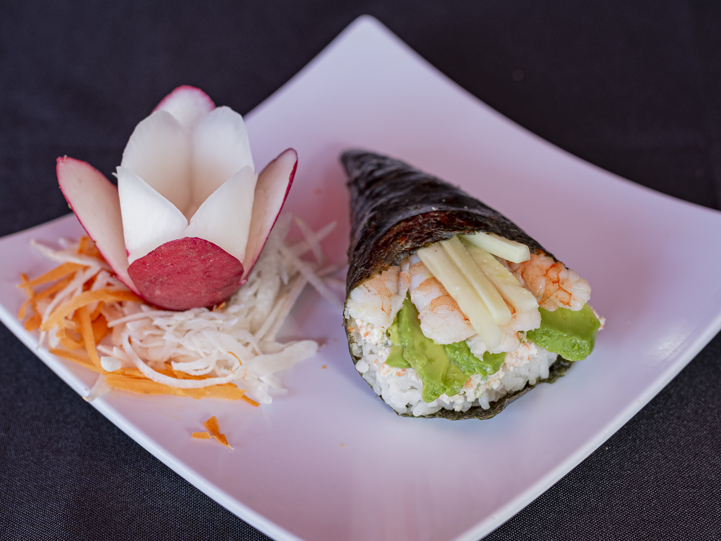 Aguacate, cangrejo cubierto con queso philadelphia, camarón y ajonjoli.