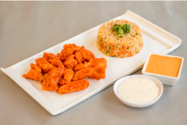 Deliciosa pechuga de pollo acompañada de arroz en yakimeshi o gohan.