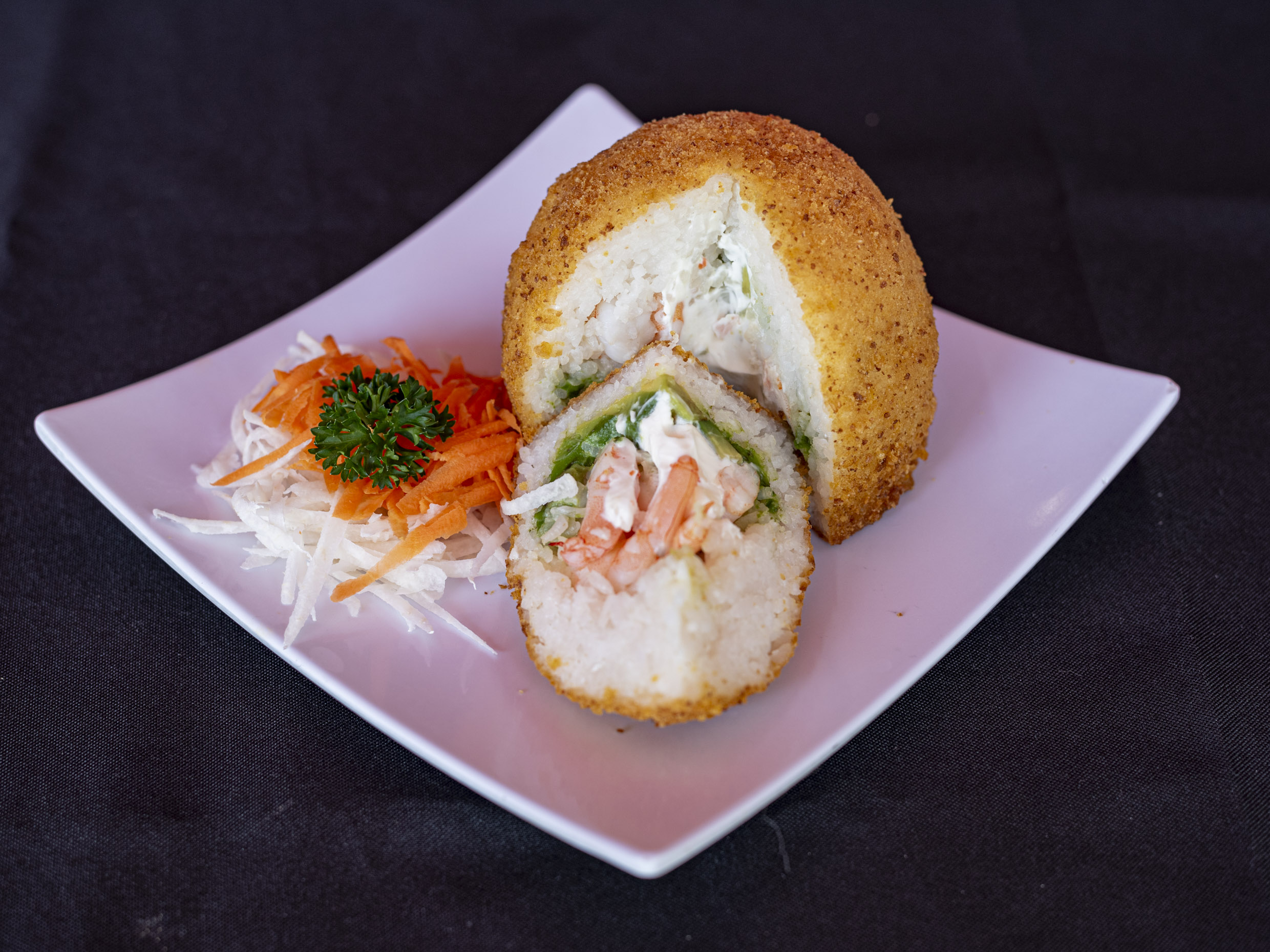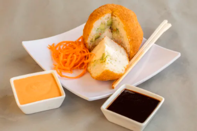 Bola de Arroz empanizada rellena de queso philadephia, aguacate y pasta tampico.