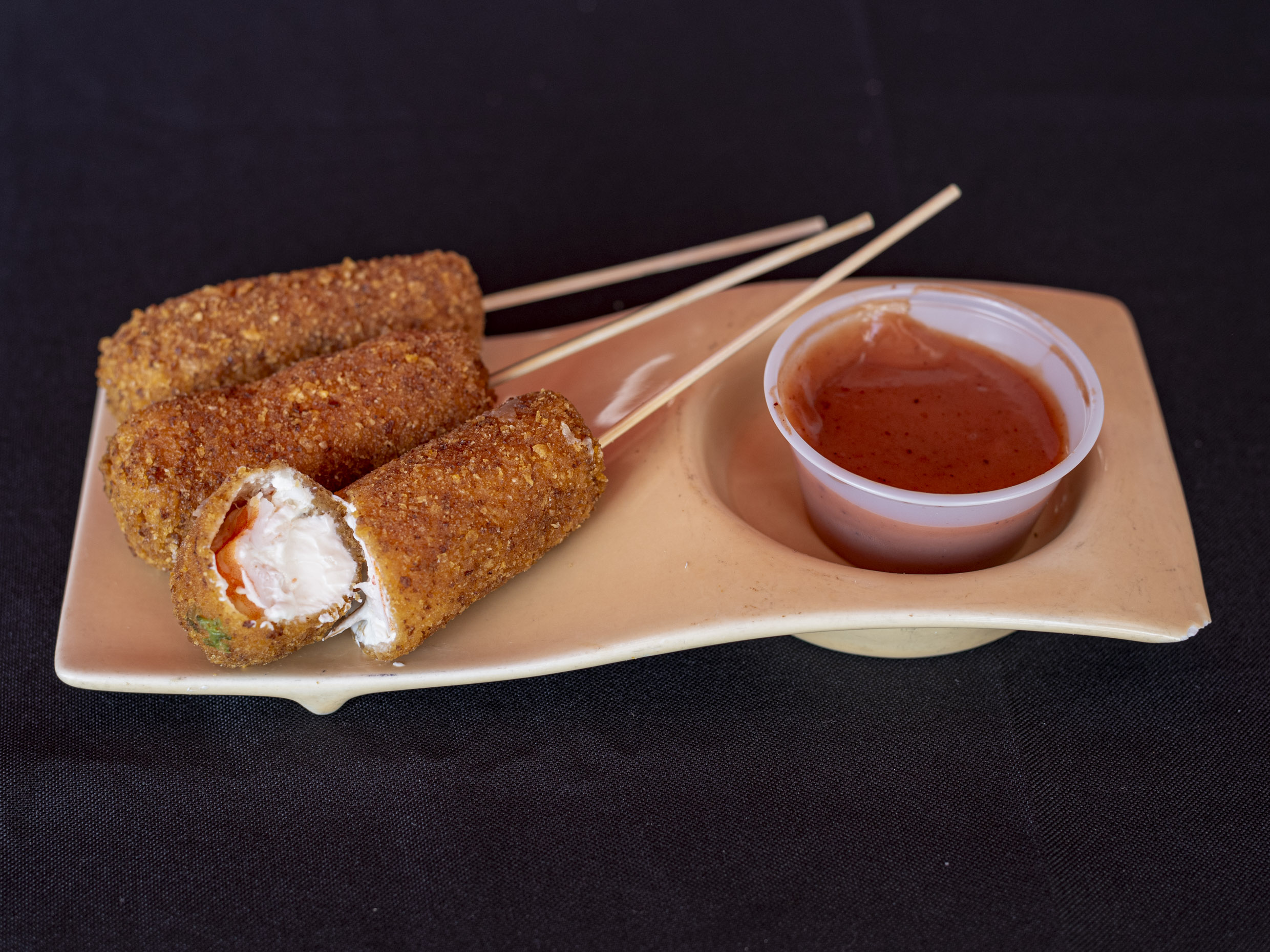 Queso Philadelphia, camarón empanizado, salmón a la plancha cubierto con pasta Tampico, acompañado de nuestra "Que salsa".