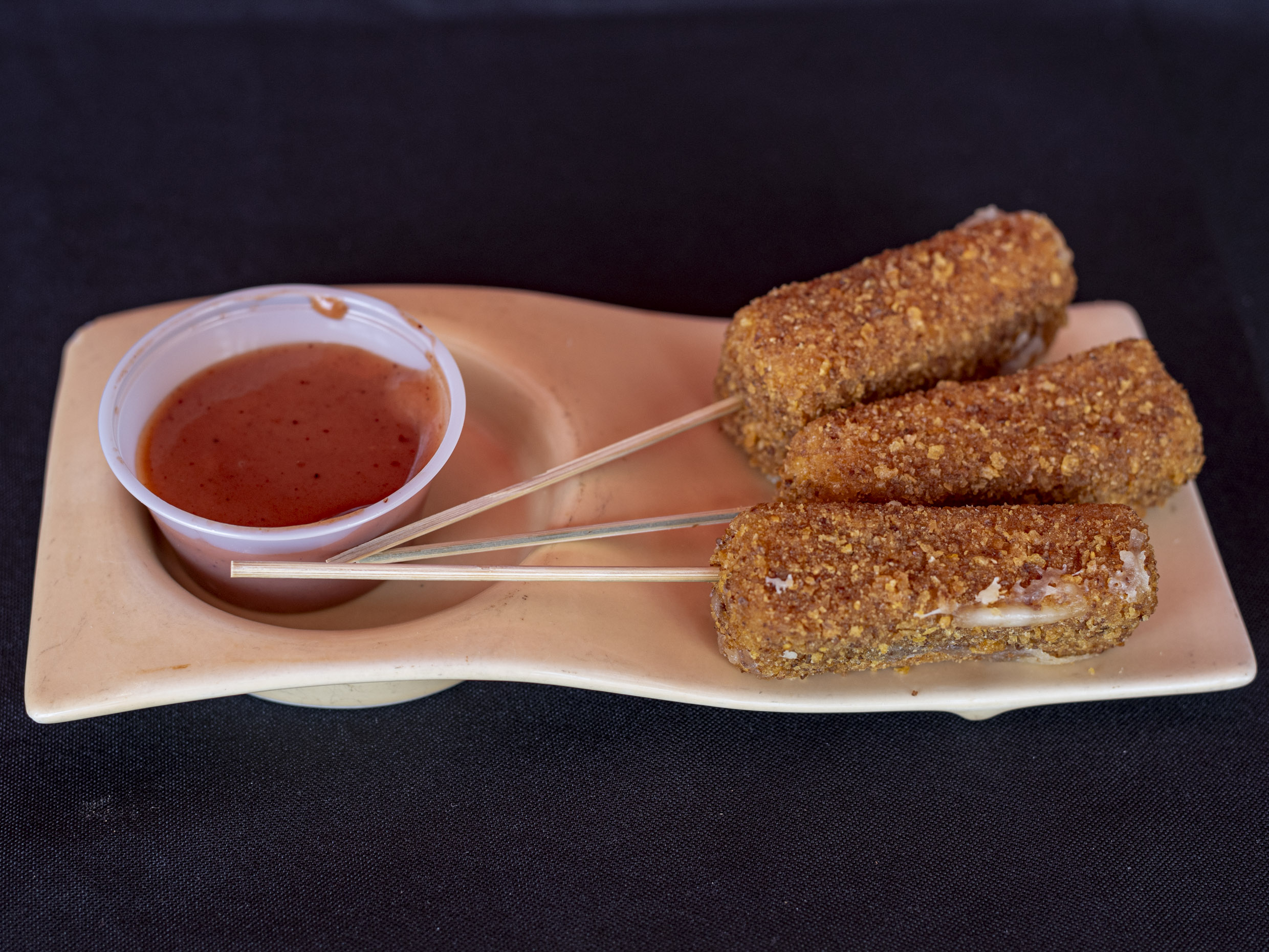 Orden con 3 brochetas empanizadas.
