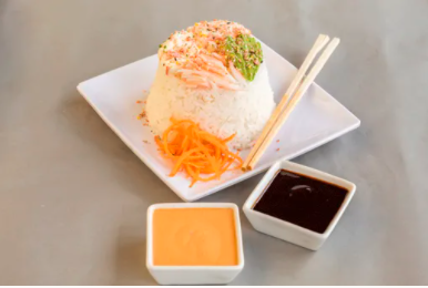 Arroz blanco al vapor con queso philadelphia, aguacate, pasta tampico, kanikama y furikake.