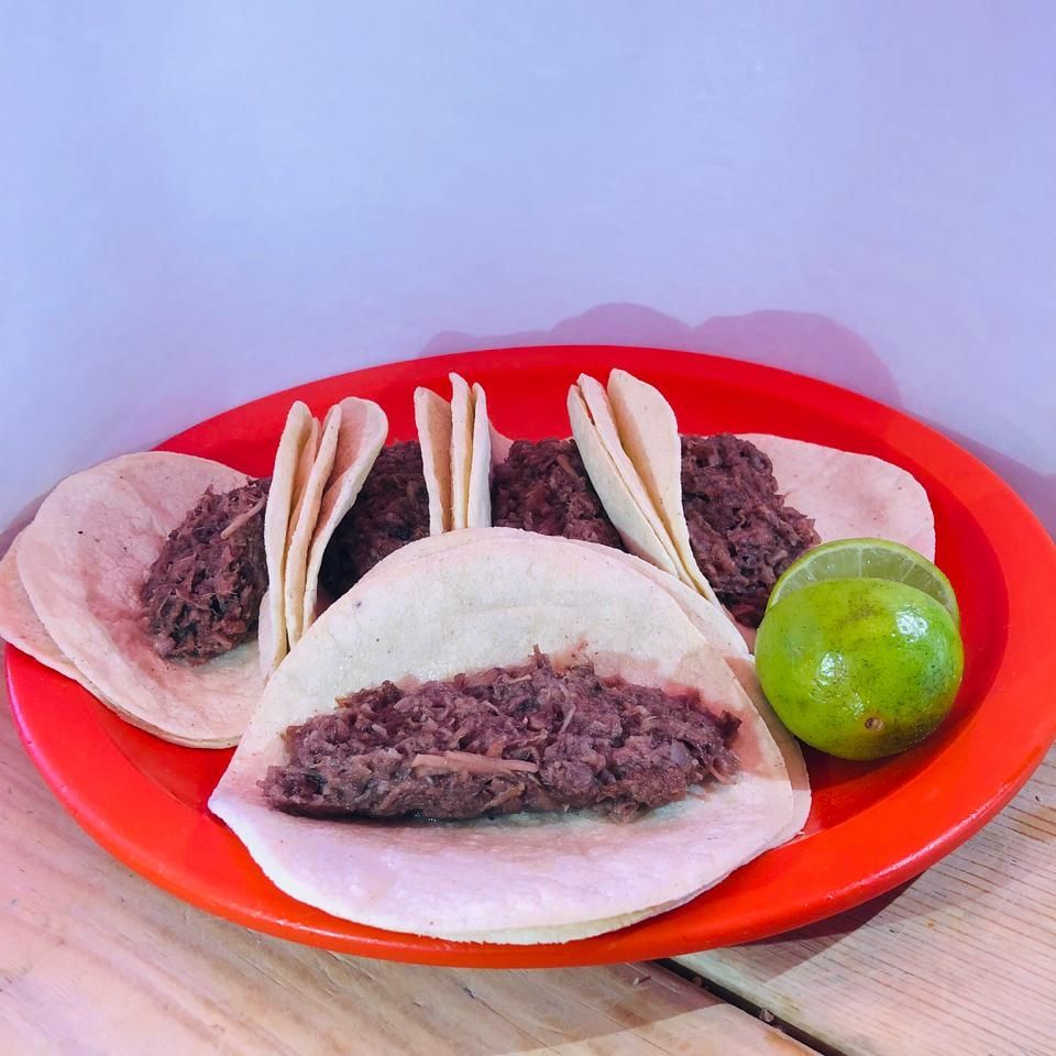 Deliciosa orden de 5 tacos de barbacoa de cabeza de res acompañado de salsa, limon, cebolla, tomate, repolloy cilantro.