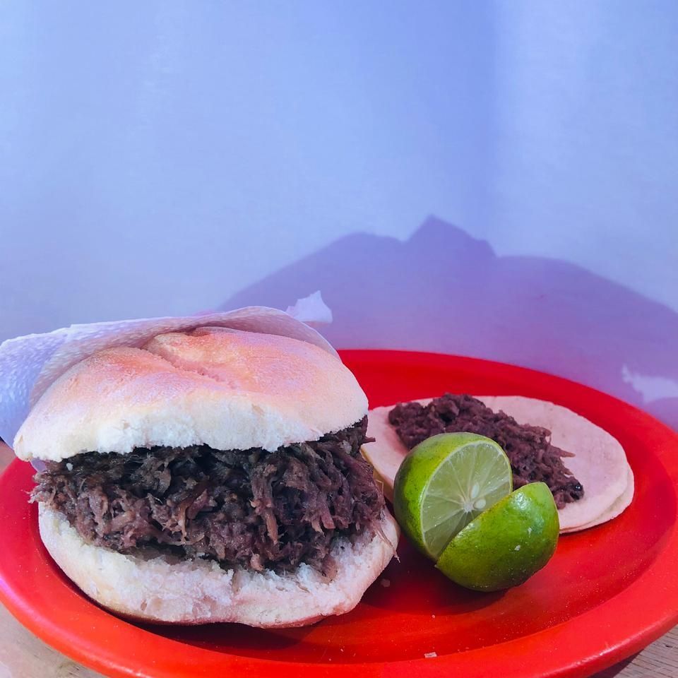 Delicioso lonche y taco de barbacoa de cabeza de res acompañado de salsa, limon, cebolla, tomate, repolloy cilantro.