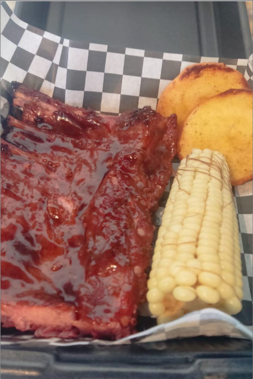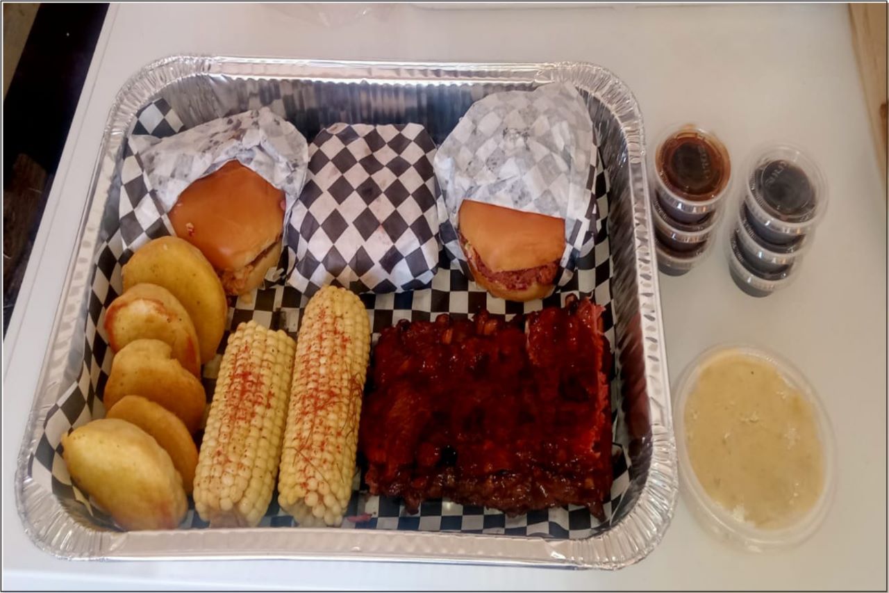 3 Sándwiches de pulled pork, 1 Kg de rack, 2 elotes, 6 panes con mantequilla y ajo, 350 gramos de puré de papa, salsas BBQ y BBQ habanero.