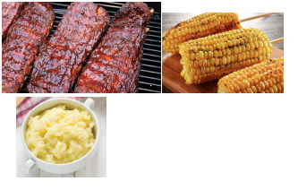 2 Kg de costilla ahumada, 4 panes de ajo y mantequilla, 6 mitades de elote, 1 puré de papa y salsas.