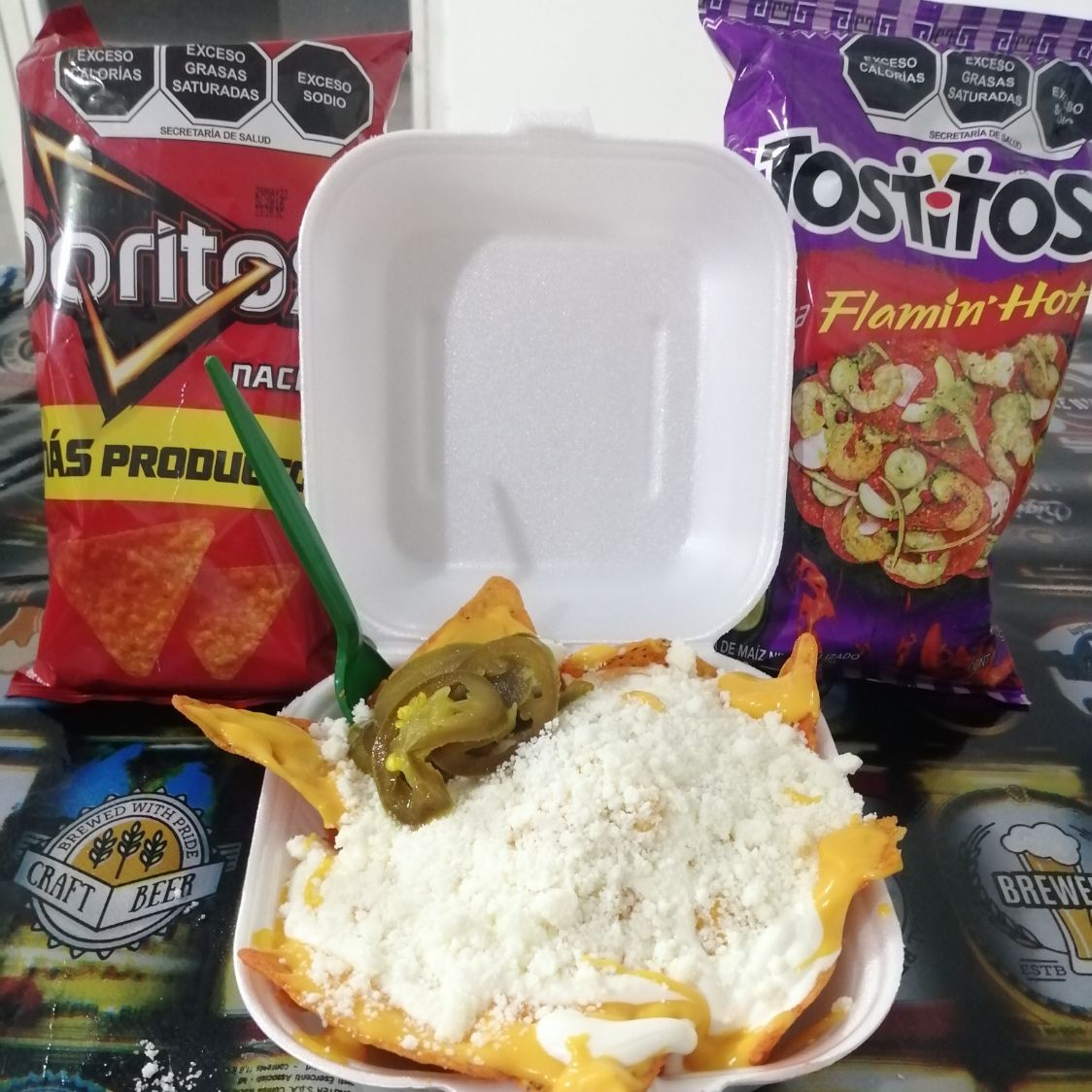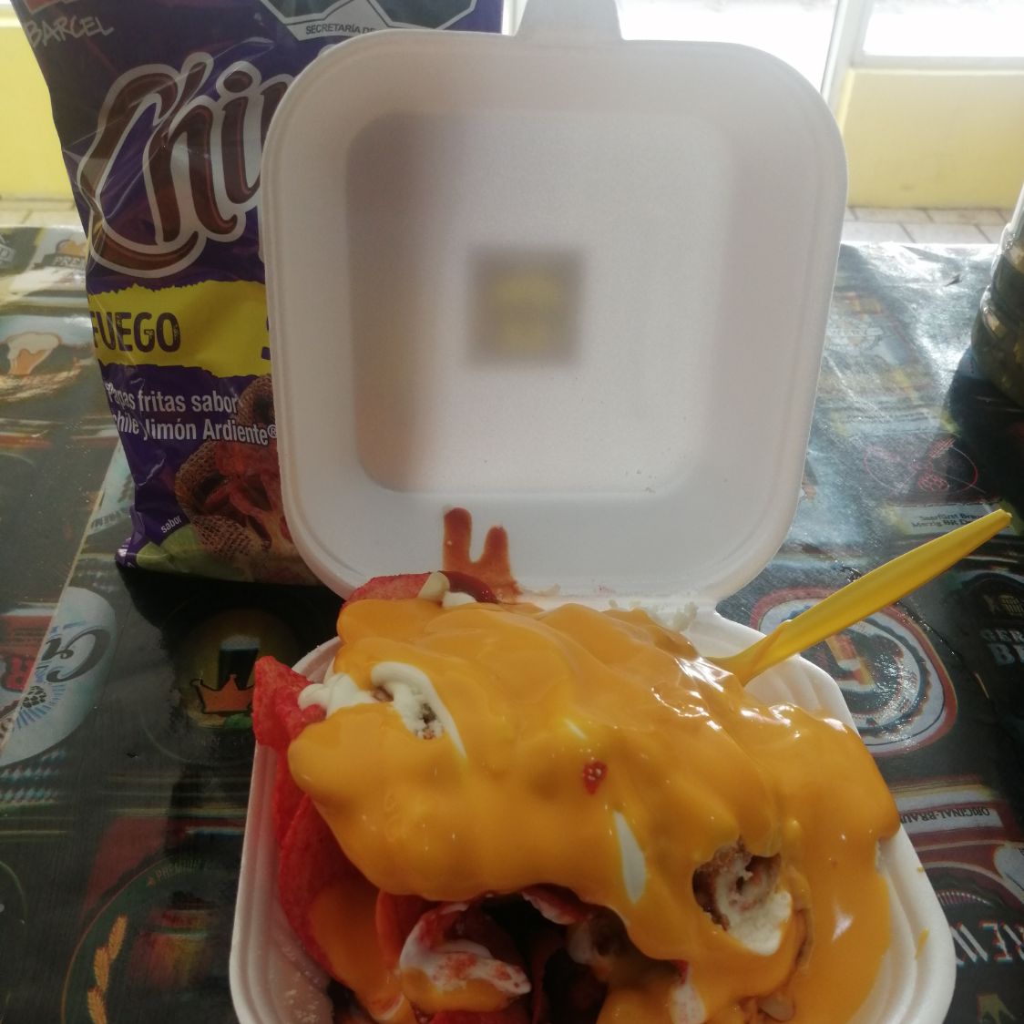 Chips fuego, elote, valentina, maggi, limón, crema, queso blanco, queso amarillo