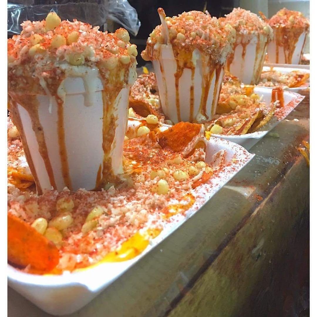 Nachos, elote en grano, queso amarillo, crema, queso blanco, chile curtido.