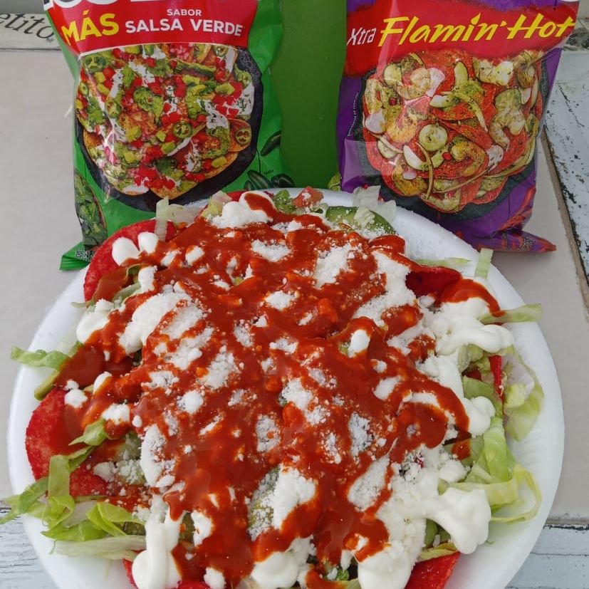 Tostitos, lechuga, pepino, tomate, aguacate, queso blanco, crema, salsa valentina