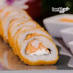 Camaron empanizado, phhiladelhia, pepino, zanahoria, jicama y col dentro del rollito