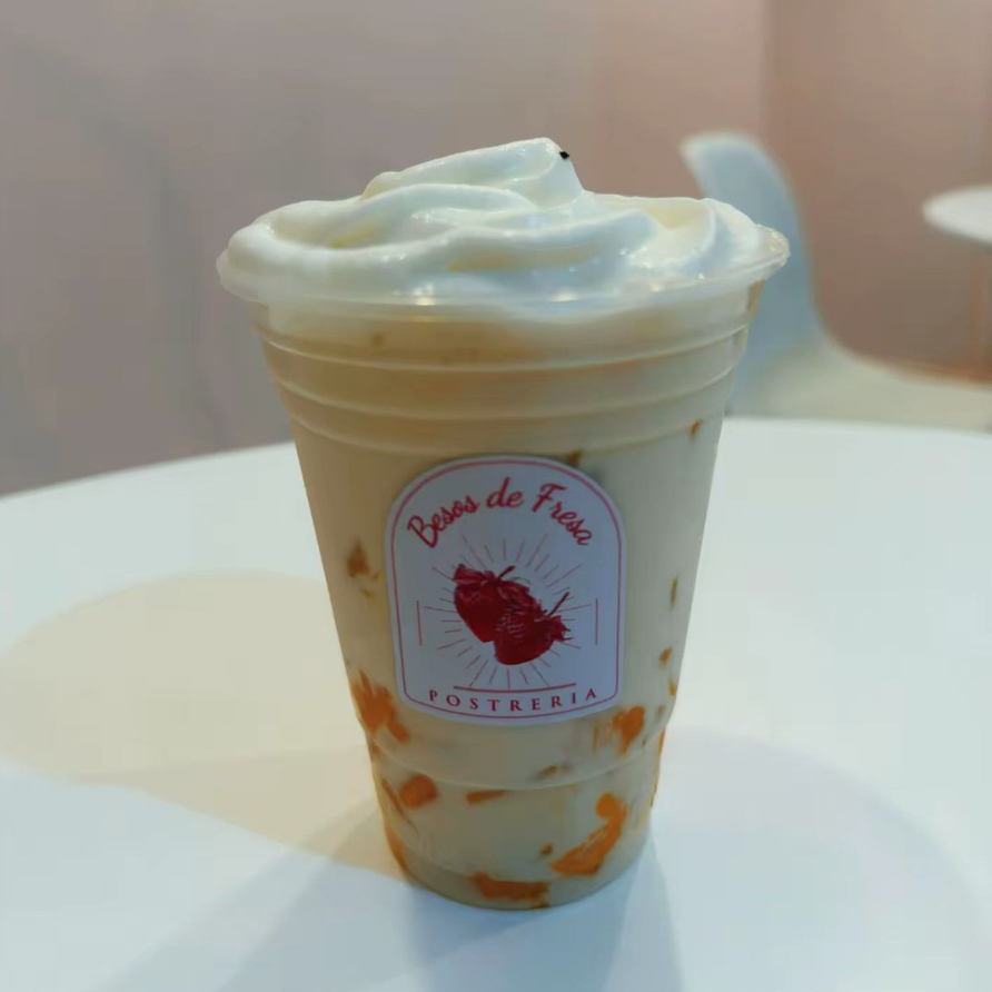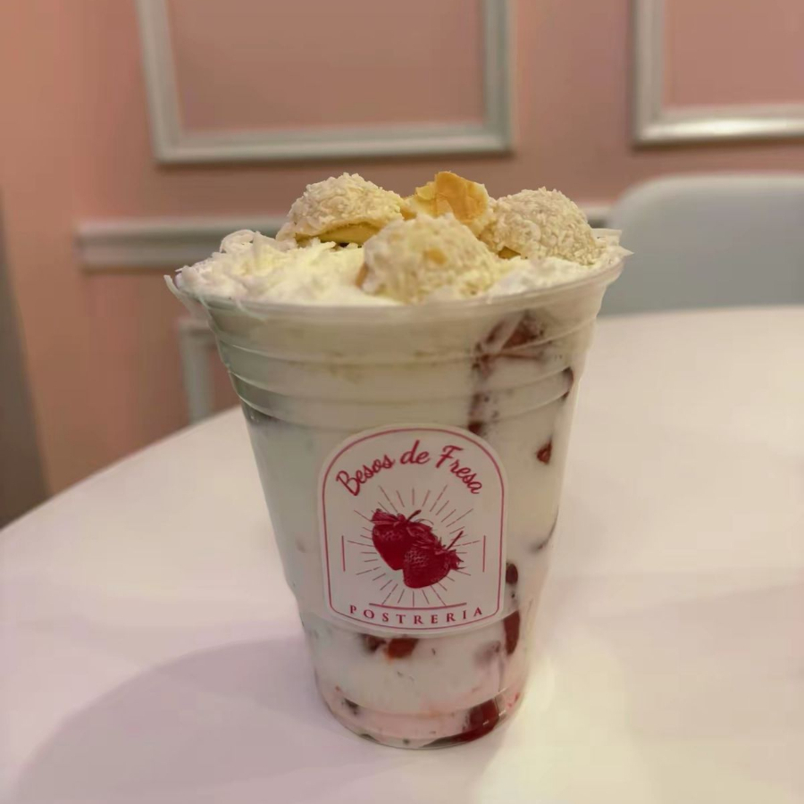 Fresas con crema en vaso de 12 oz con un jarabe y topping a elegir.