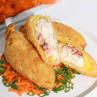 Rollo empanizado y frito. Por dentro Aguacate, queso crema, pepino, trocitos de pollo frito y tocino. Topping salsa bbq, buffalo mango picante.