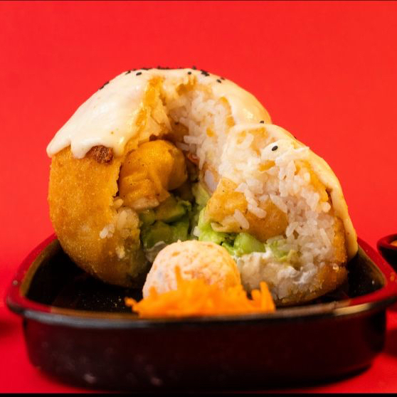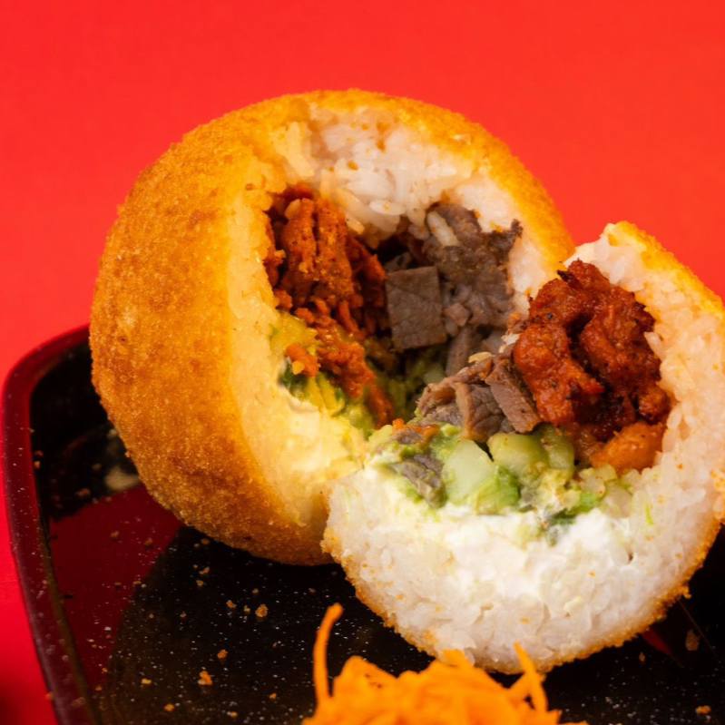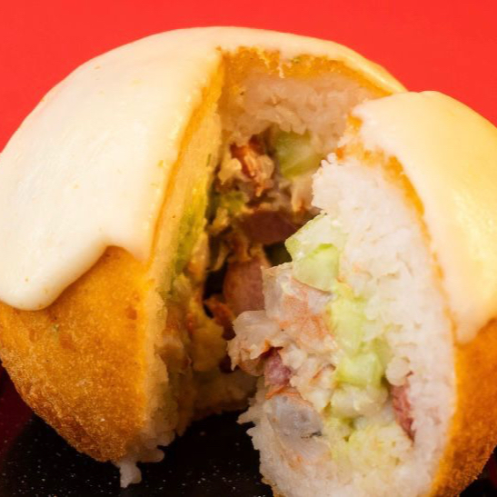 Bola de arroz empanizada y frita por dentro: Aguacate, queso crema, pepino, una proteina a elegir (pollo, res, camaron) topping salsa chipotle y salsa unagi.