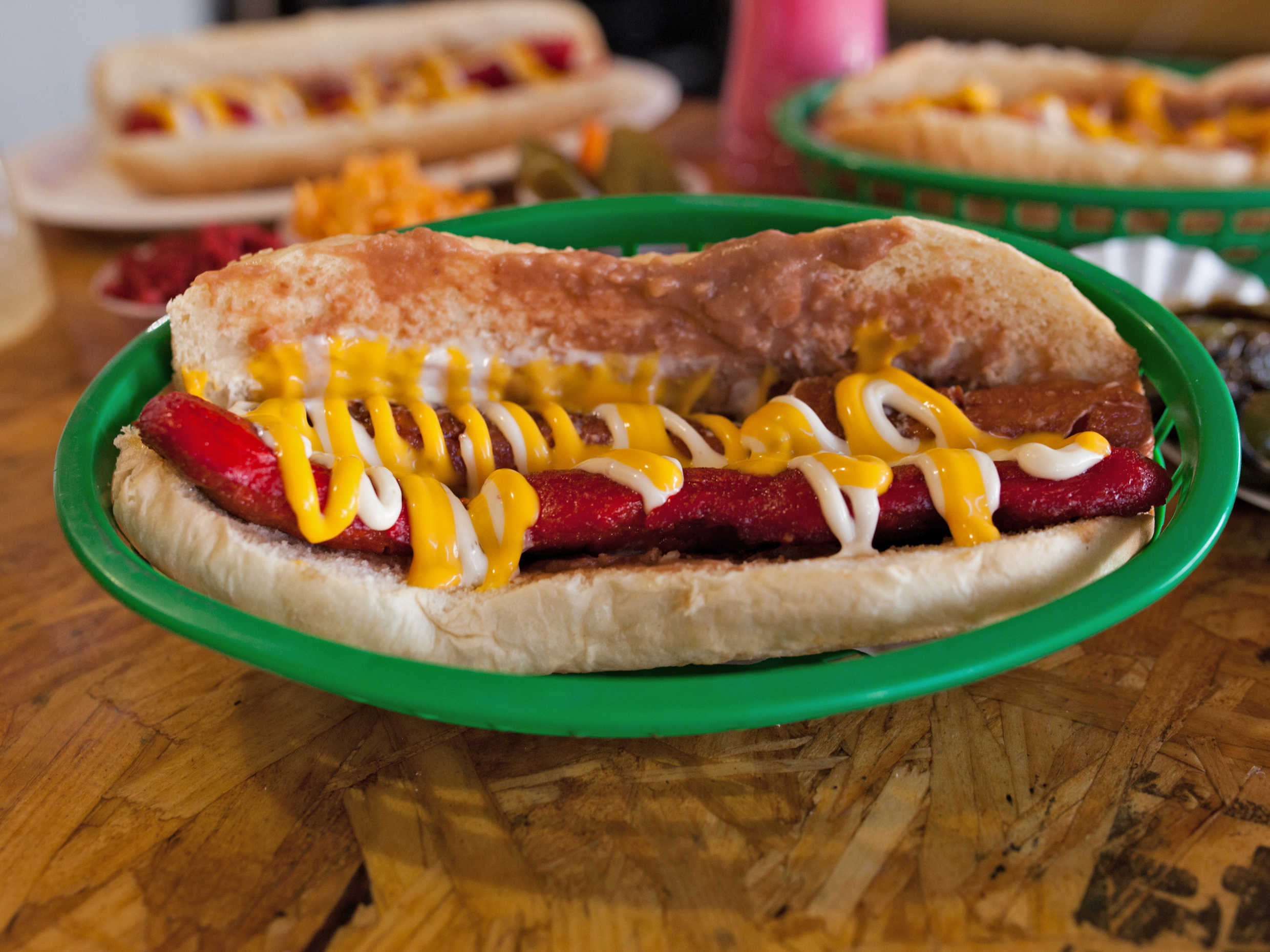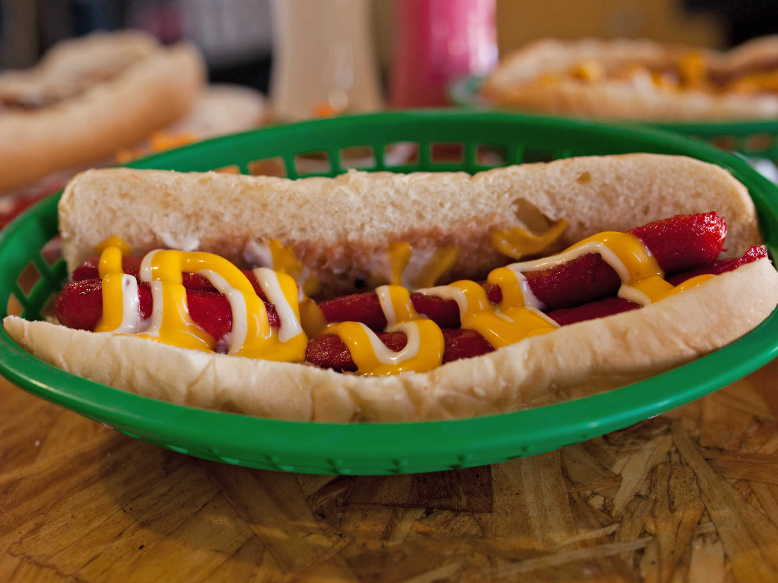 Dos salchicha de pavo con tus aderezos favoritos, queso, cátsup, mostaza o mayonesa.