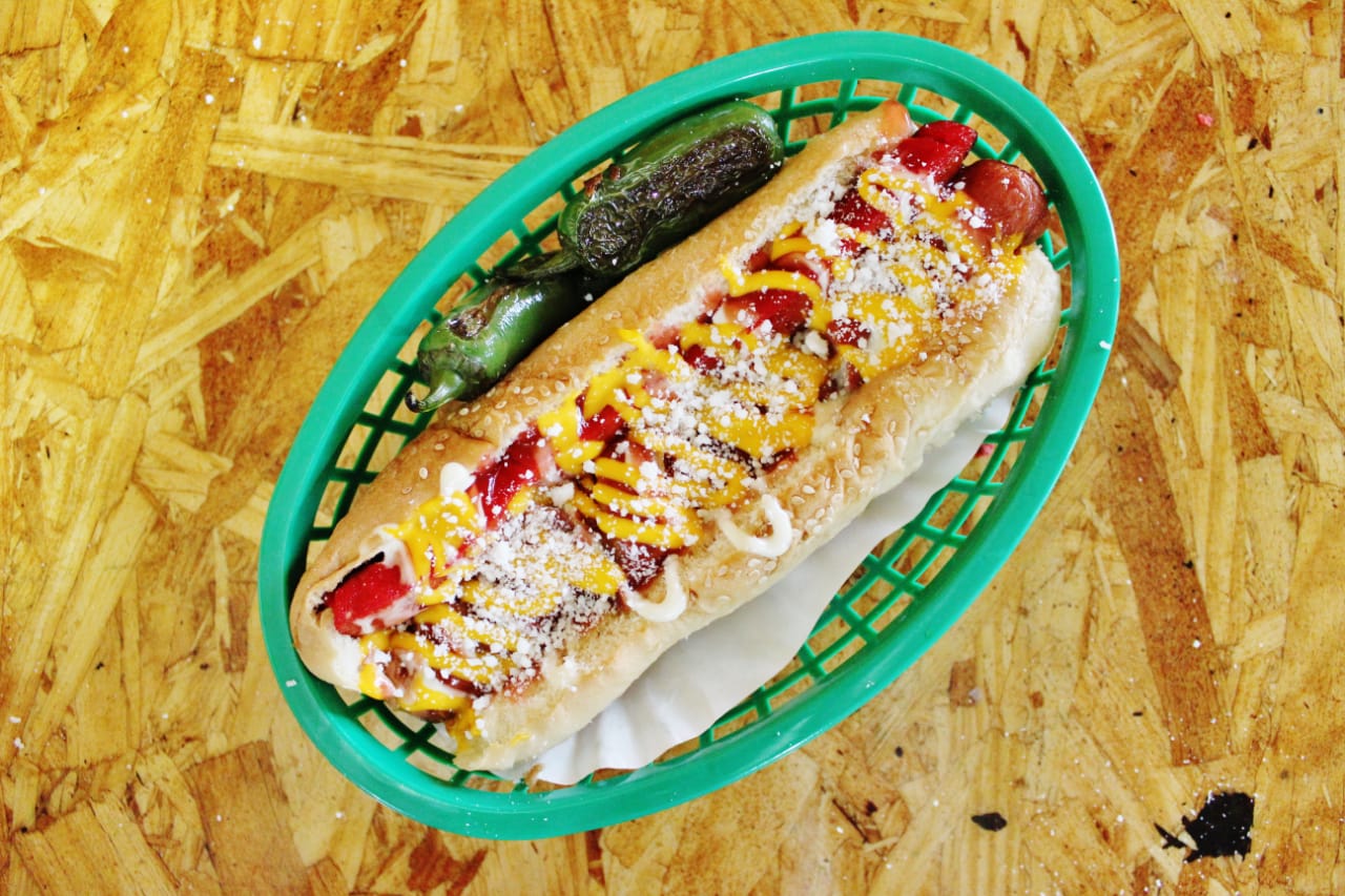 Pan, frijoles, tomate, cebolla, tocino, cátsup, mayonesa, mostaza y queso amarillo, platillo personal